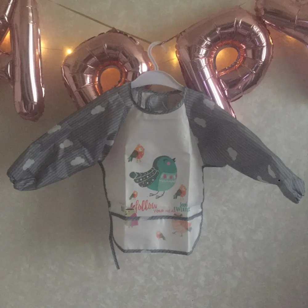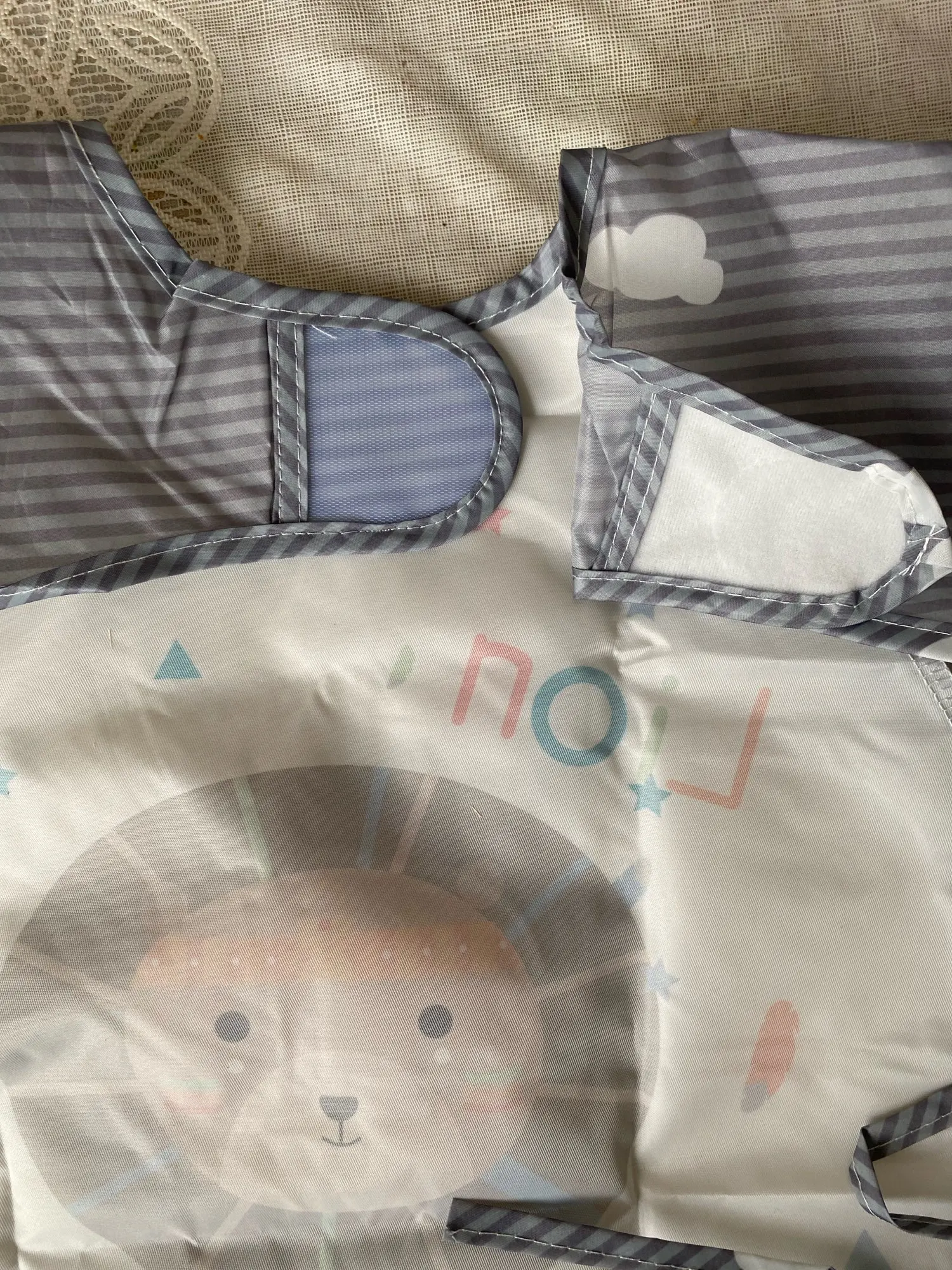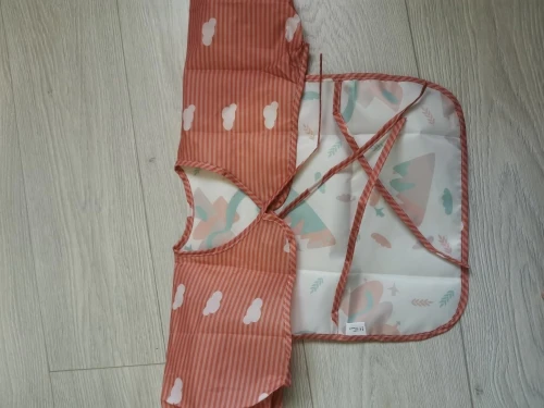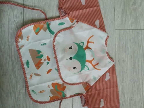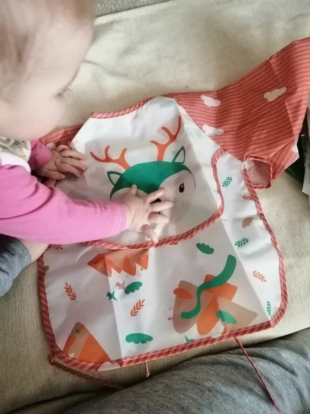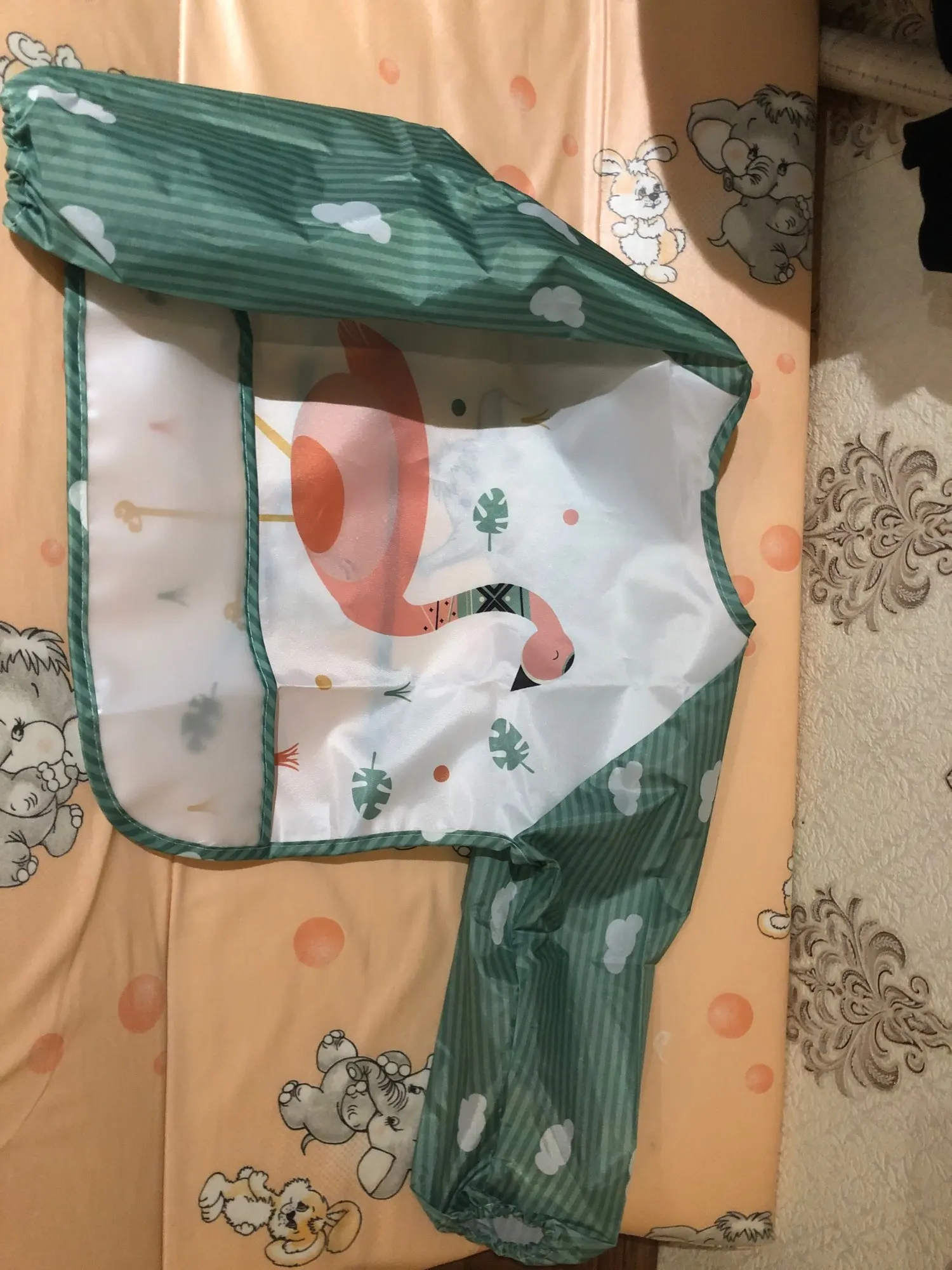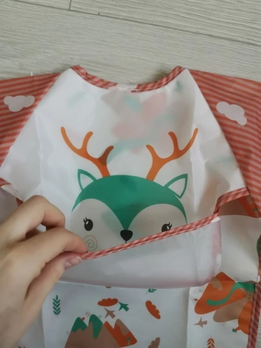 хороший фартучек, рукава ткань, белая зона - клеёнка. кармашек есть. на рост 70 см великоват, топорщится) но не смертельно, навырост пойдет. ворот на странной "лысой" липучке, но держится. есть ещё тесьма, чтоб завязать на поясе. пока нам великовато чтоб завязывать.