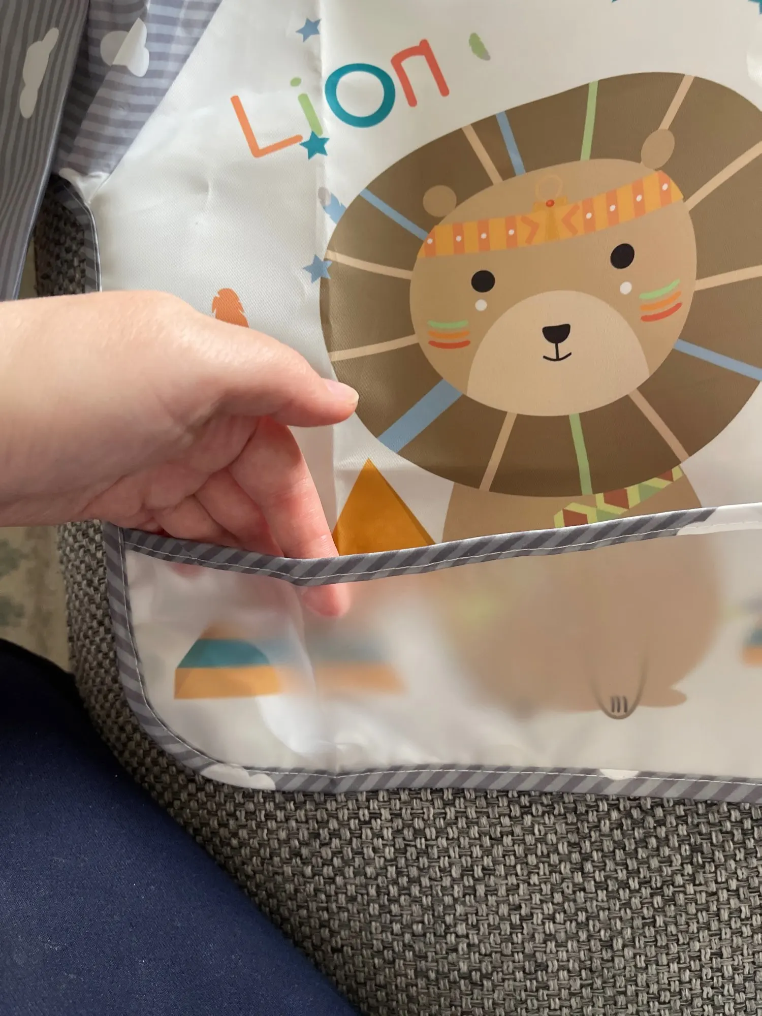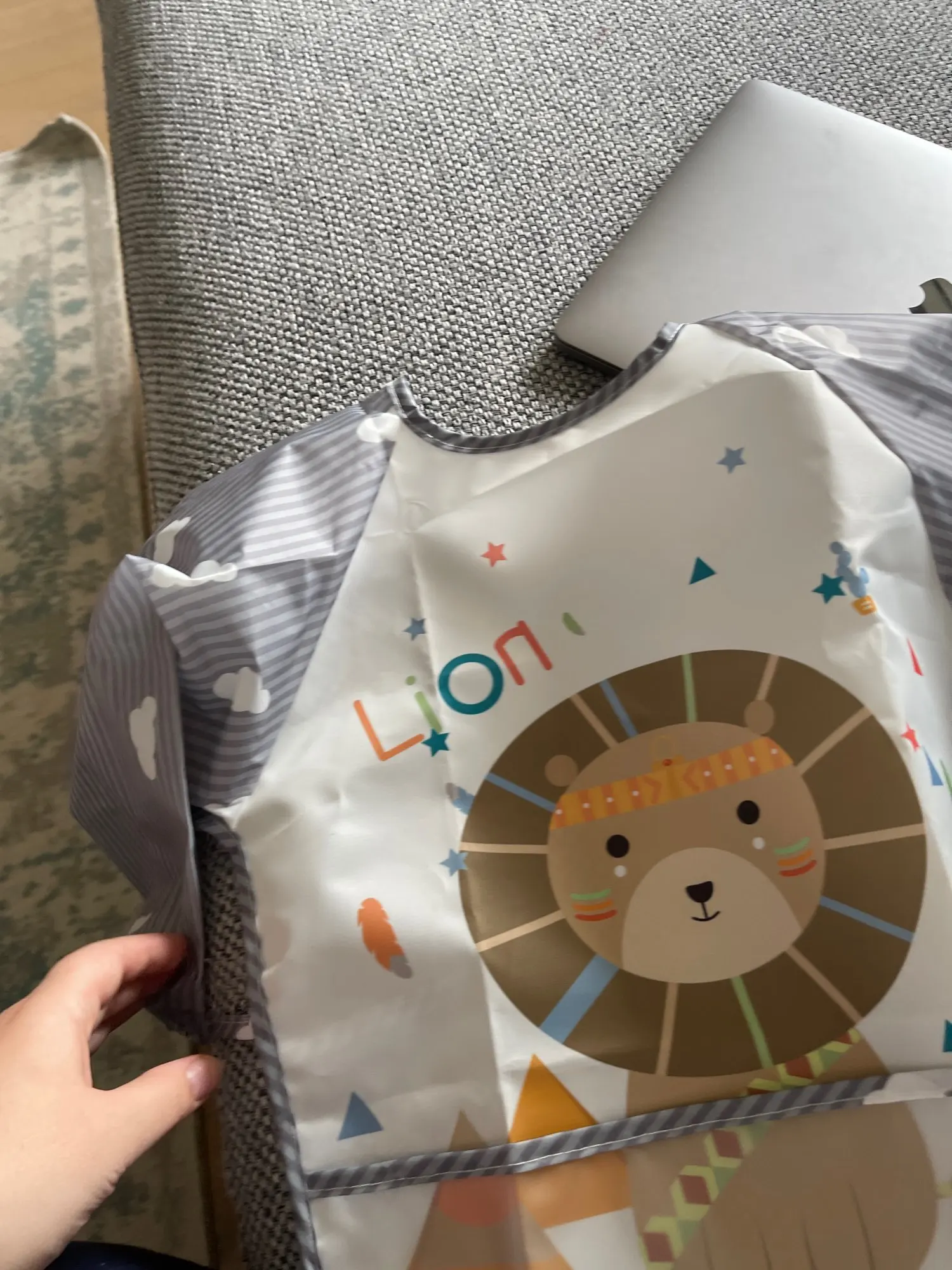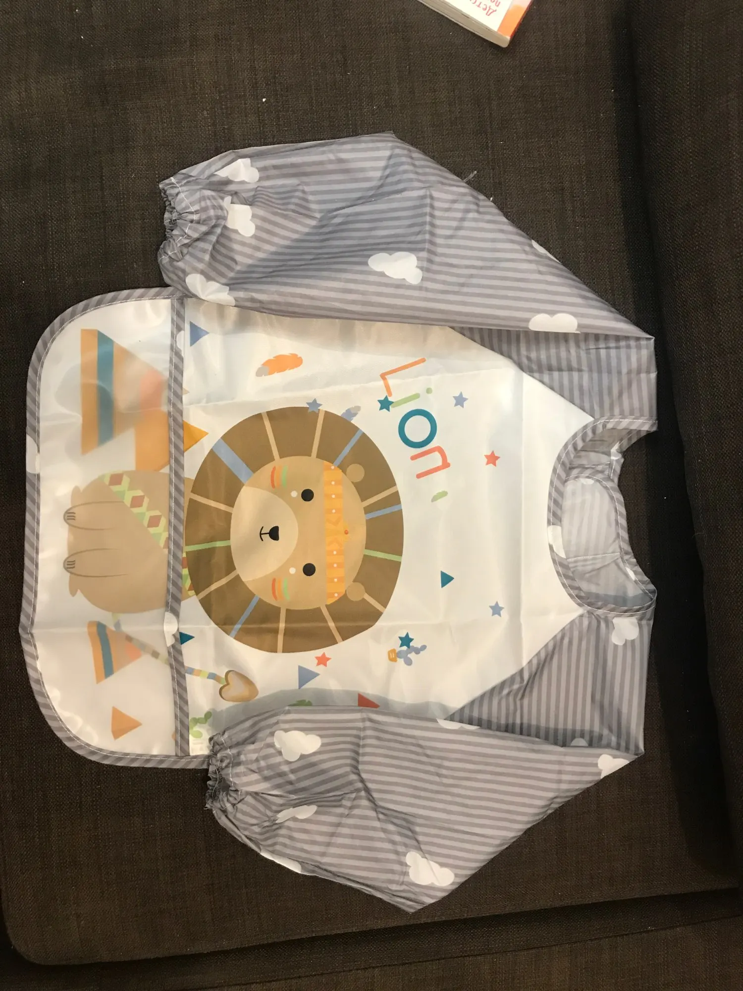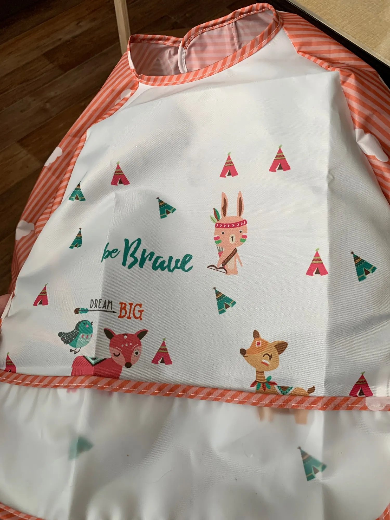 хороший фартучек, рукава ткань, белая зона - клеёнка. кармашек есть. на рост 70 см великоват, топорщится) но не смертельно, навырост пойдет. ворот на странной "лысой" липучке, но держится. есть ещё тесьма, чтоб завязать на поясе. пока нам великовато чтоб завязывать.