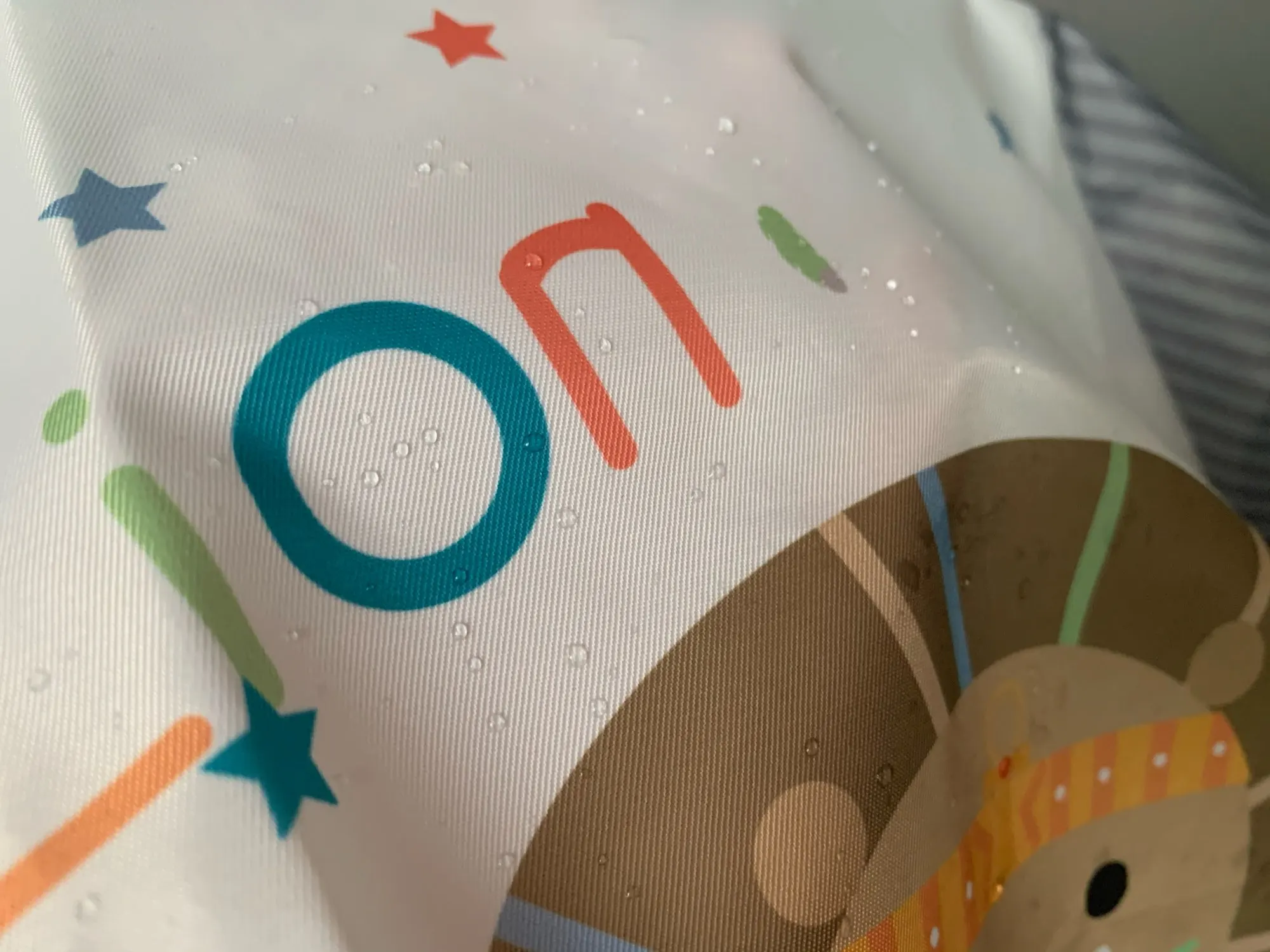 Фартук такой же, как на фото продавца. Для ребенка 1,2 года большой, но это ожидаемо, т.к. в отзывах об этом писали, заказала специально с запасом. Ткань, как не промокает, так и не дышит, похоже. А так в общем все неплохо.