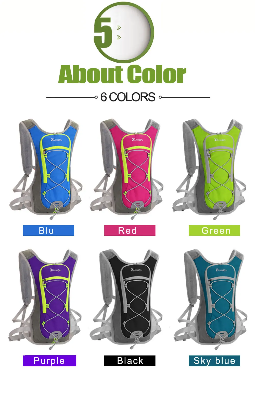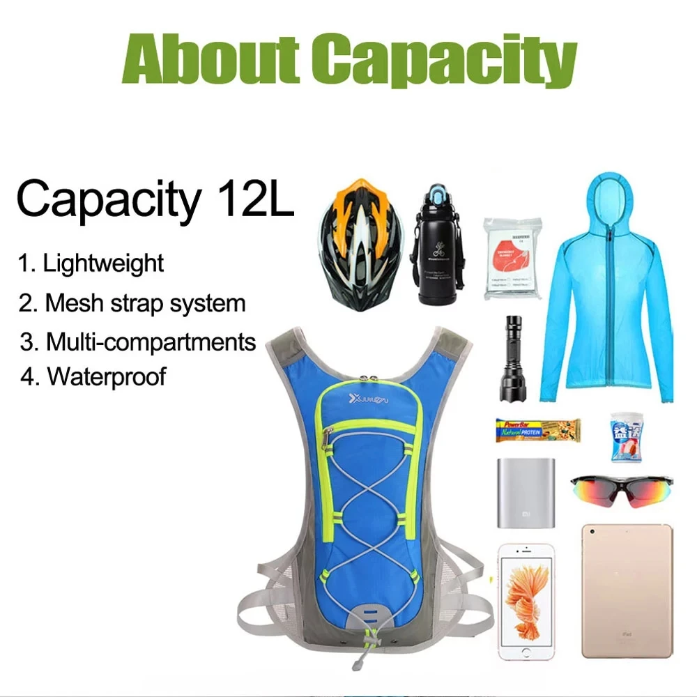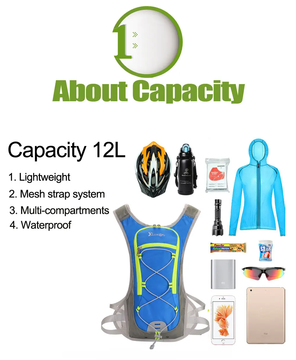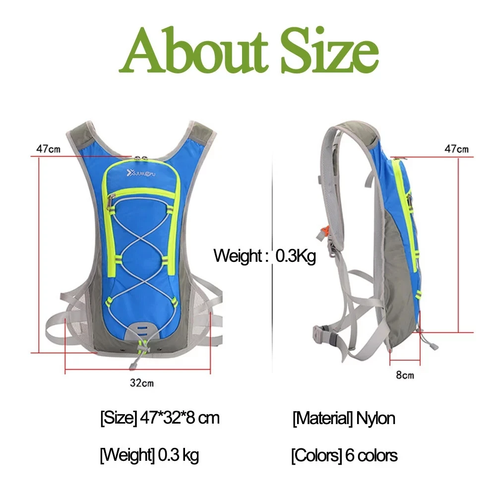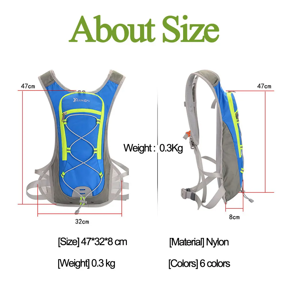 Подробнее о продукте: Название: рюкзак для велоспорта и бега Цвет: зеленый, синий, красный, черный, фиолетовый, застенчивый синий объем: 12 л Применение: бег, треккинг, бег, пеший туризм, езда на велосипеде, кемпинг, катание на лыжах, рыбалка и т. д. Сочетание: рюкзак можно использовать вместе с сумкой для воды объемом 3 л характеристики: Сверхлегкий (около 300 г), водоотталкивающий, дышащий, устойчивый к разрыву, пригодный для носки. Несколько систем загрузки отвечают вашим потребностям. Напоминание: по этой ссылке на товары представлены разные комбинации. Пожалуйста, выберите правильный вариант продукта в соответствии с вашими потребностями.