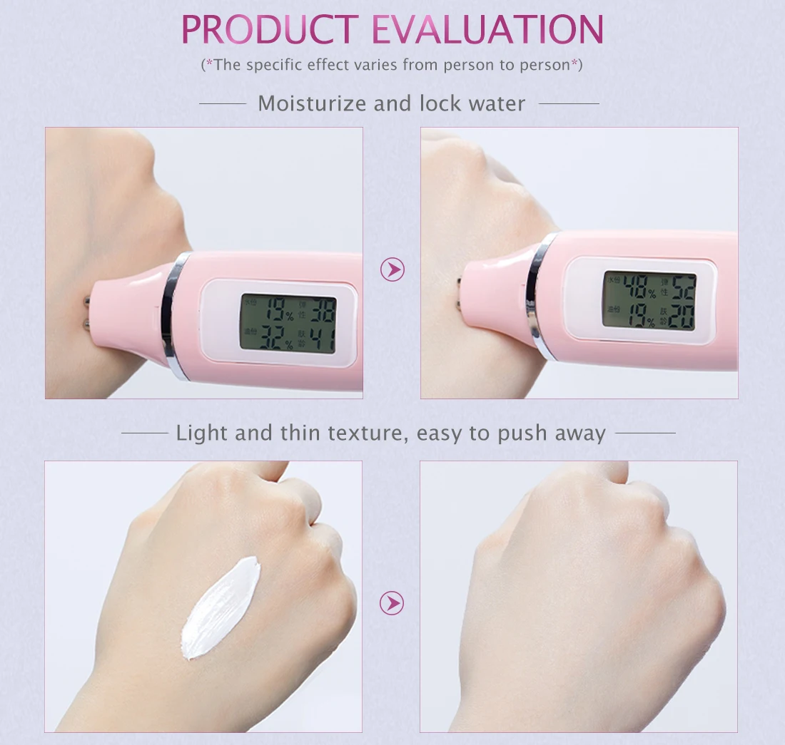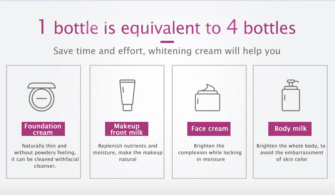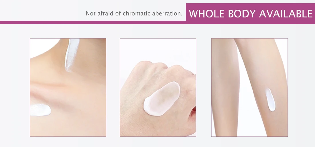 Этот продукт обладает отбеливающим фактором, который может эффективно образовывать слой белой пленки на поверхности кожи, осветляя и отбеливая кожу. Он легко распределяется по коже, нежный и увлажненный, легко впитывается кожей, отбеливает и омолаживает, длится увлажнением и деликатной кожей. Делает кожу нежной, мягкой и белой, упругой и гладкой, сияющей и полупрозрачной.