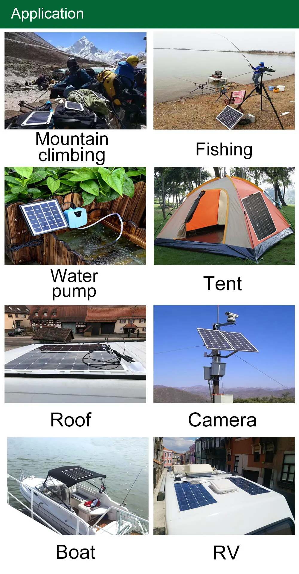 1. Гибкая солнечная панель подходит для различных сцен, таких как RV, трейлер, кемпер, лодка, яхта, уличный светильник, кабина, Tentetc.2. Он принимает для домашних животных, обладает высокой светильник с высоким коэффициентом пропускания, безопасно и надежно, не боится высокой температуры, и имеет нету опасности горения или взрыву.3. Компонент содержит байпасный диод, и в цепи используется защита от перегрузки по току и защита от реверса.4. Благодаря новейшей технологии ламинирования, она легче, мягче, прочнее и имеет более длительный срок службы.5. Гибкая конфигурация параметров солнечного модуля для более гибкой конфигурации контроллеров и батарей.