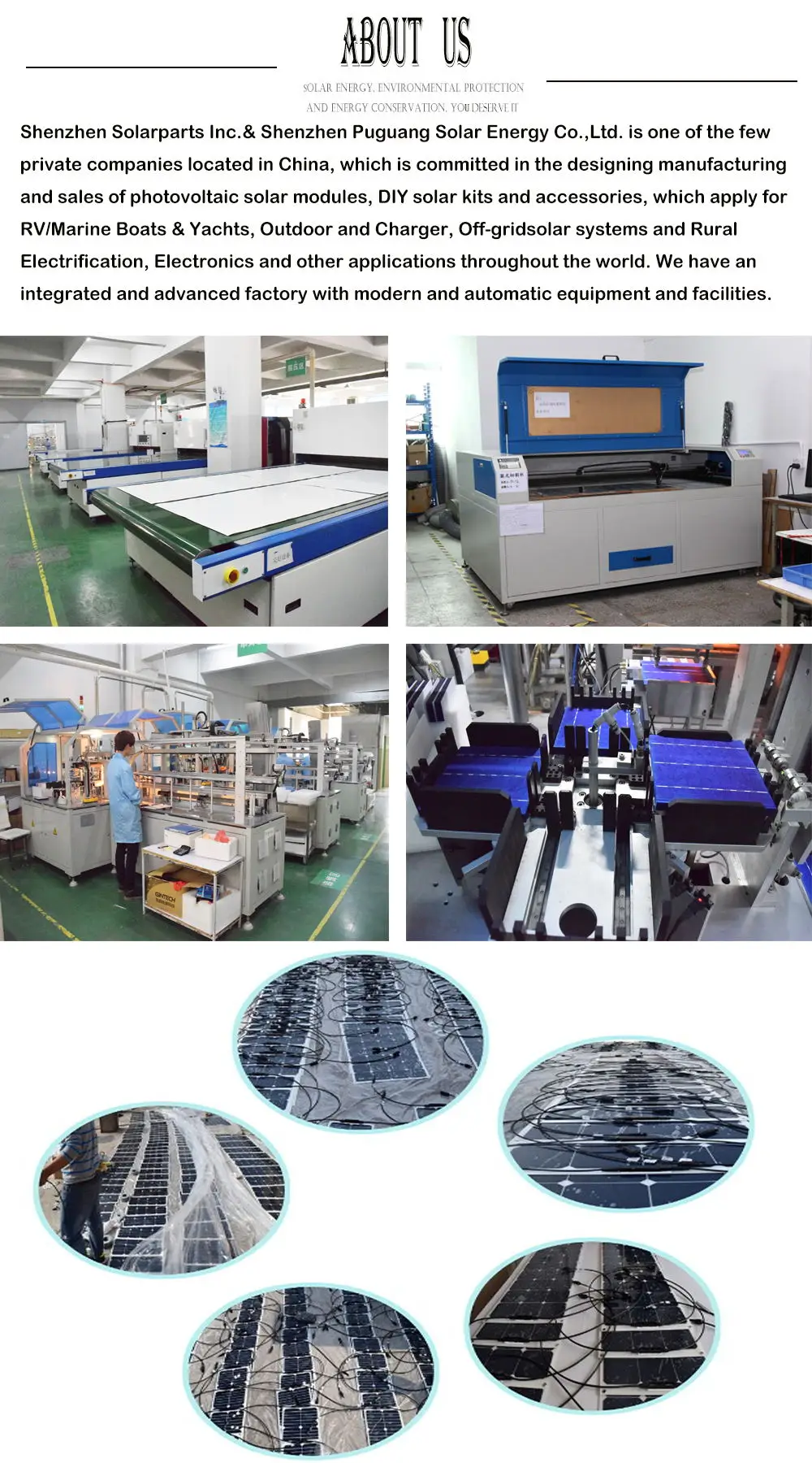 XINPUGUANG Гибкая солнечная панель делает с высокой эффективностью монокристаллический элемент, 19.6% эффективность преобразования, может быть согнута 30-40 градусов, может быть установлен на изогнутой поверхности. Всего на 80% легче, чем стеклянная солнечная панель, толщина 3 мм, легко носить с собой, легко грузить, легко установить. Применяется для Golf car, Yacht, Boat , RV,Caravan, Электромобиль, туристический автомобиль для путешествий, патрульный автомобиль, крыша, кемпинг, генерация энергии крыши, палатка, морская и т. д.