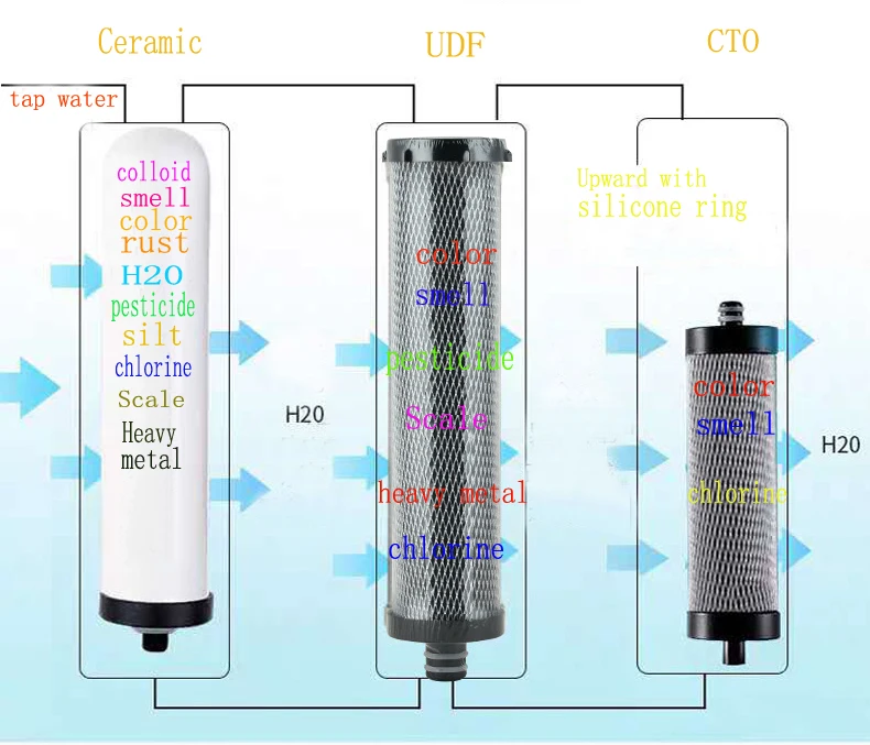 Семейный водопроводной фильтр для воды/кухонный фильтр для воды: Особенности: 1) быстрая установка с помощью крана 2) корпус из нержавеющей стали 304 с активированным углем/угольным блоком/керамикой в сочетании с защитой качества воды 3) специальная функция фильтра может удалять запах, запах, цвет и Органические химические вещества, а также бактериальные Первый этап: 0,1 микрон керамический комбинированный угольный фильтр для воспроизведения функций следующим образом: A) удаляет водоросли, ржавчину, осадки, взвешенные твердые вещества; B) подавляет рост и уменьшает следующие вредные бактерии на скорость лучше, чем 99.99% C) уменьшает криптоспоридиум на 99.999% D) уменьшает гиардию и другие кисты на 99.999% E) удаляет морщины F) уменьшает мутность Второй этап: 5 микрон Угольный Блок Фильтра Со следующими характеристиками: (1) для воды с высоким содержанием хлора и уменьшением запаха (2) Высокая емкость грязи продлевает срок службы (3) уменьшает хлор/хлорамины, ЛОС, пестициды и запах/запах загрязняющих веществ Третий этап: CTO фильтр: Чтобы удалить химикаты и тяжелые металлы, улучшите вкус воды;