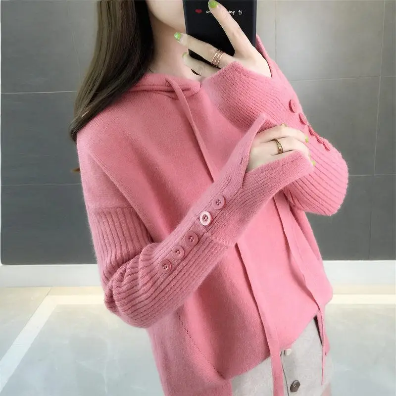 Женский короткий свитер с капюшоном, однотонный трикотажный пуловер свободного кроя, Осень-зима 2021