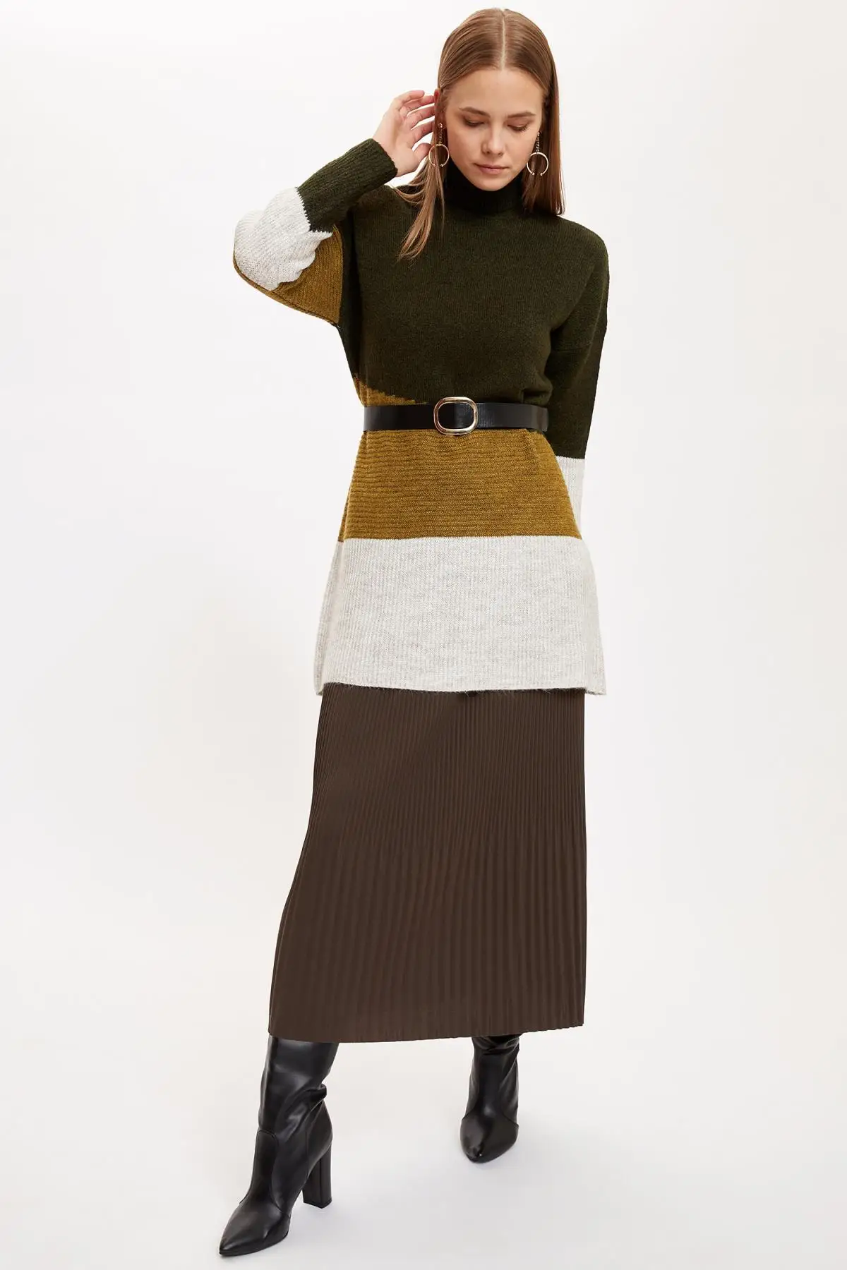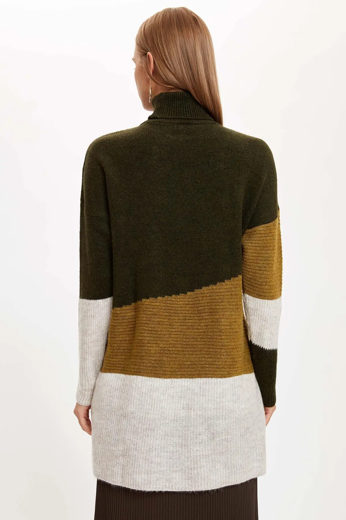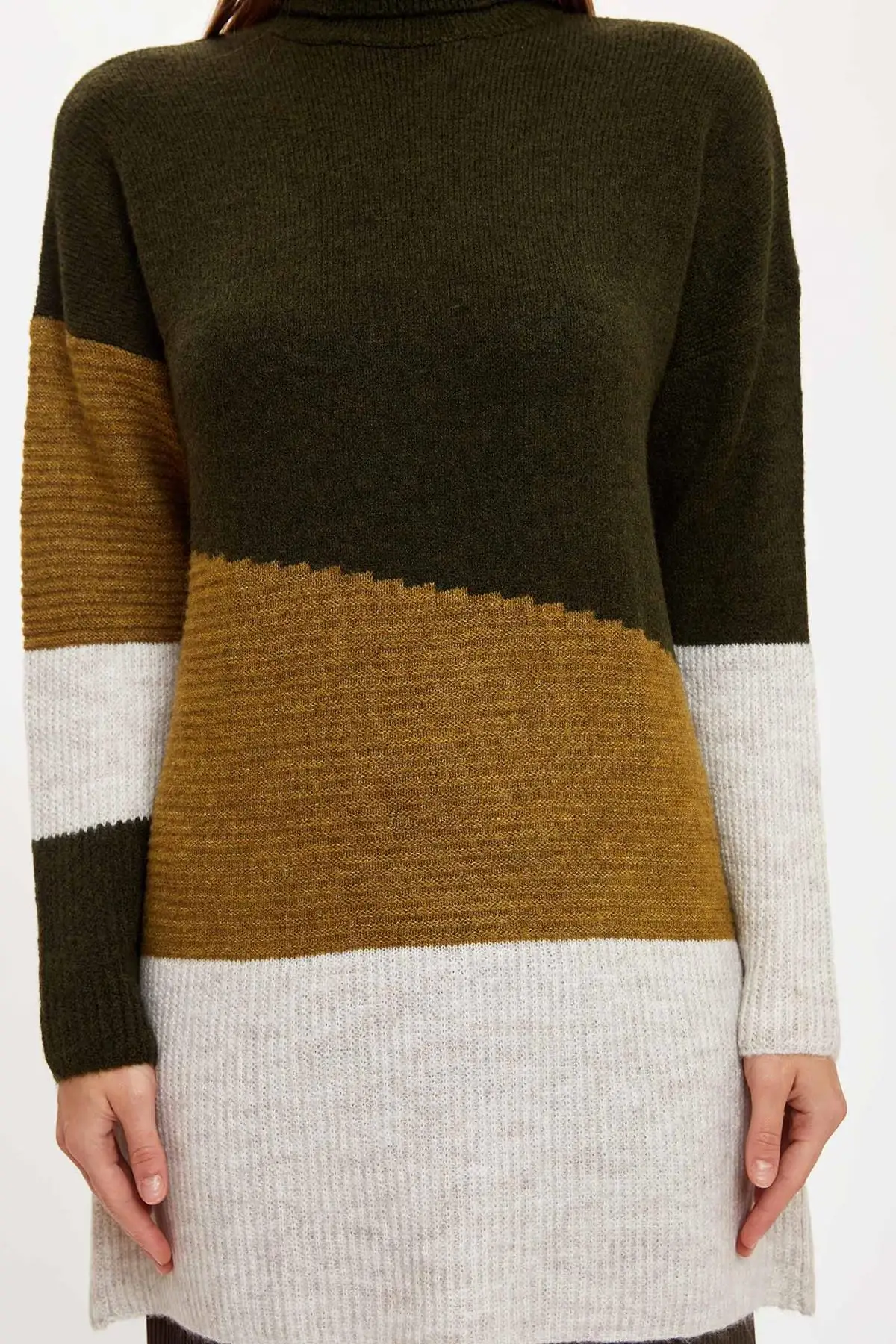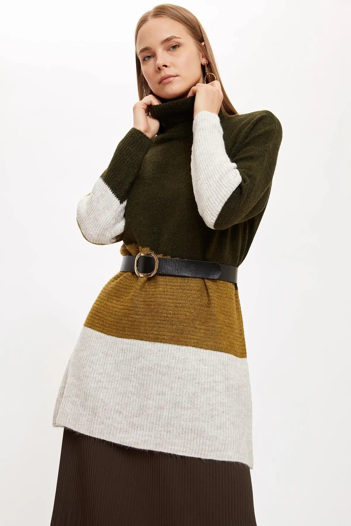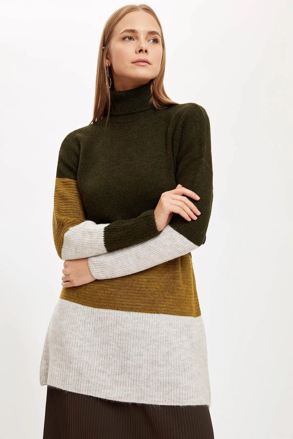 Defacto зимняя женская трикотажная Цвет блок пол с высоким, плотно облегающим шею воротником Трикотаж Туника женский длинный пуловер Fashion-J2977AZ20WN