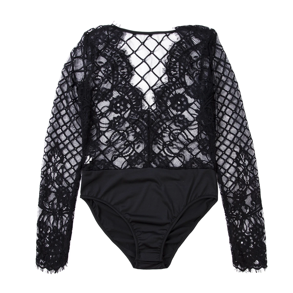 Боди женское кружевное с длинным рукавом и глубоким V-образным выре...