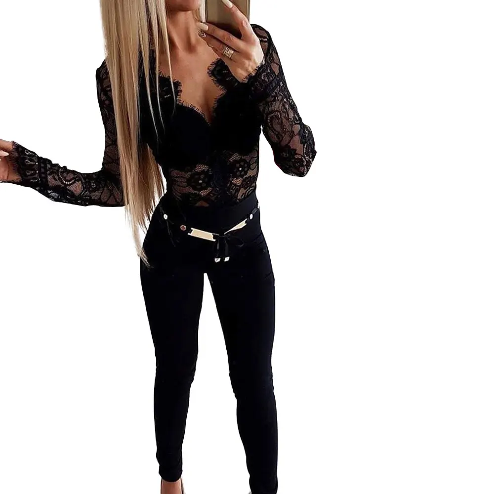 Женское сексуальное боди с v-образным вырезом, кружевное однотонное прозрачное облегающее боди, женские модные облегающие осенние Вечерние боди с длинным рукавом