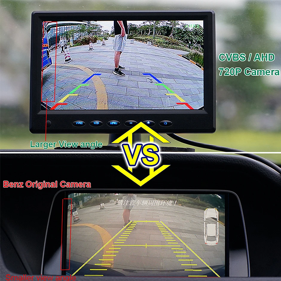 Через управление видеосигналом, он может поддерживать CVBS и AHD дисплеи сигнала.• Камера "CVBS720P-AHD720P": ( CVBS )→ Вырежьте белый экран →( AHD)• Камера AHD1080P:(AHD1080P 1920x1080 175 ° )→ Отрежьте белый экран →( CVBS 1280x720 125 °)