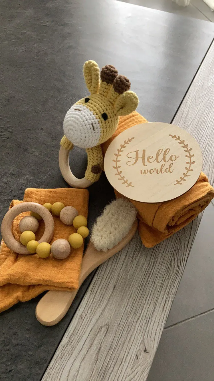Это красиво по непревзойденной цене, сделка. Увидев это, я не думал, что это будет так красиво лично. Содержимое коробки: -Chapa Привет мир. Дерево, около 10 см в диаметре. -Финиш муслина. -Гарнитура крючка в форме жирафа. Деревянное кольцо большое, оно подходит к руке взрослого. Отделка жирафа идеальна. Звук деликатный, как колокольчики. -Baby brush. Очень гладко, хотя некоторые щетина «очищена». -Кусачки с деревянными бусинами. Желтые покрыты силиконом или чем-то подобным и имеют мягкую текстуру. -Нагрудник из той же ткани, что и муслин. Он открывается кнопками на спине.