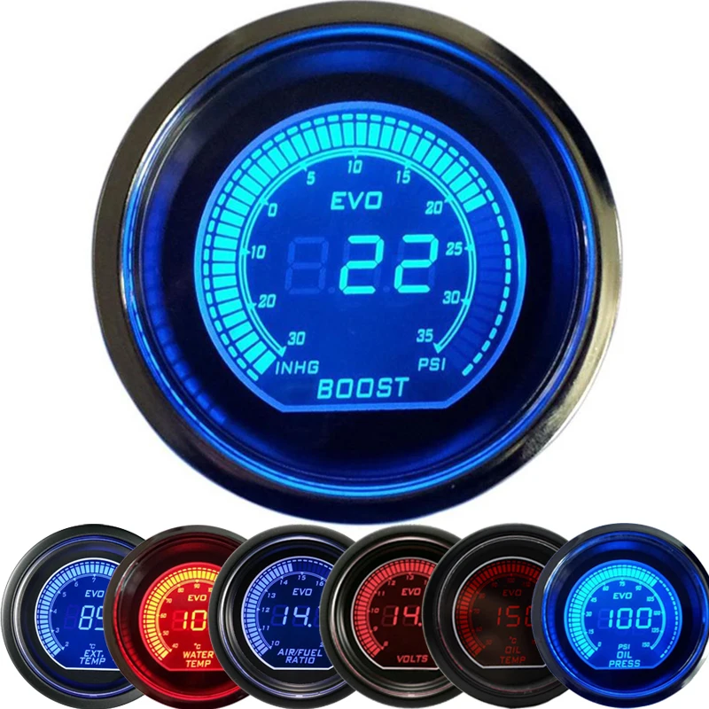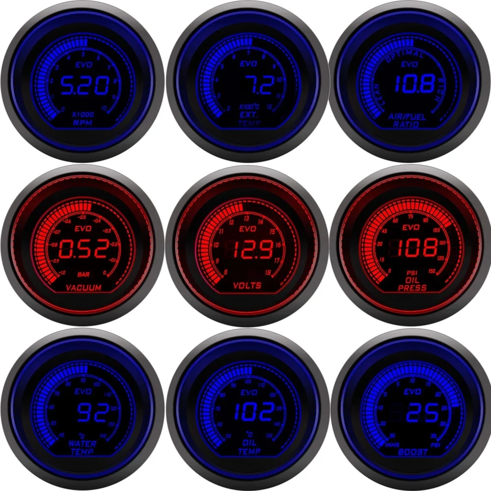 1. Датчик покажет цифровой и аналоговый СВЕТОДИОДНЫЙ индикатор.2. Цифровой ЖК-дисплей, светодиодный двойной красный синий дисплей3. Приспособление: подходит для большинства бензиновых транспортных средств, подходит для 2 "или 52 мм Диаметр манометра держатель