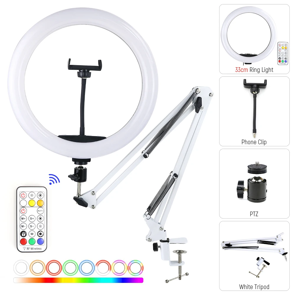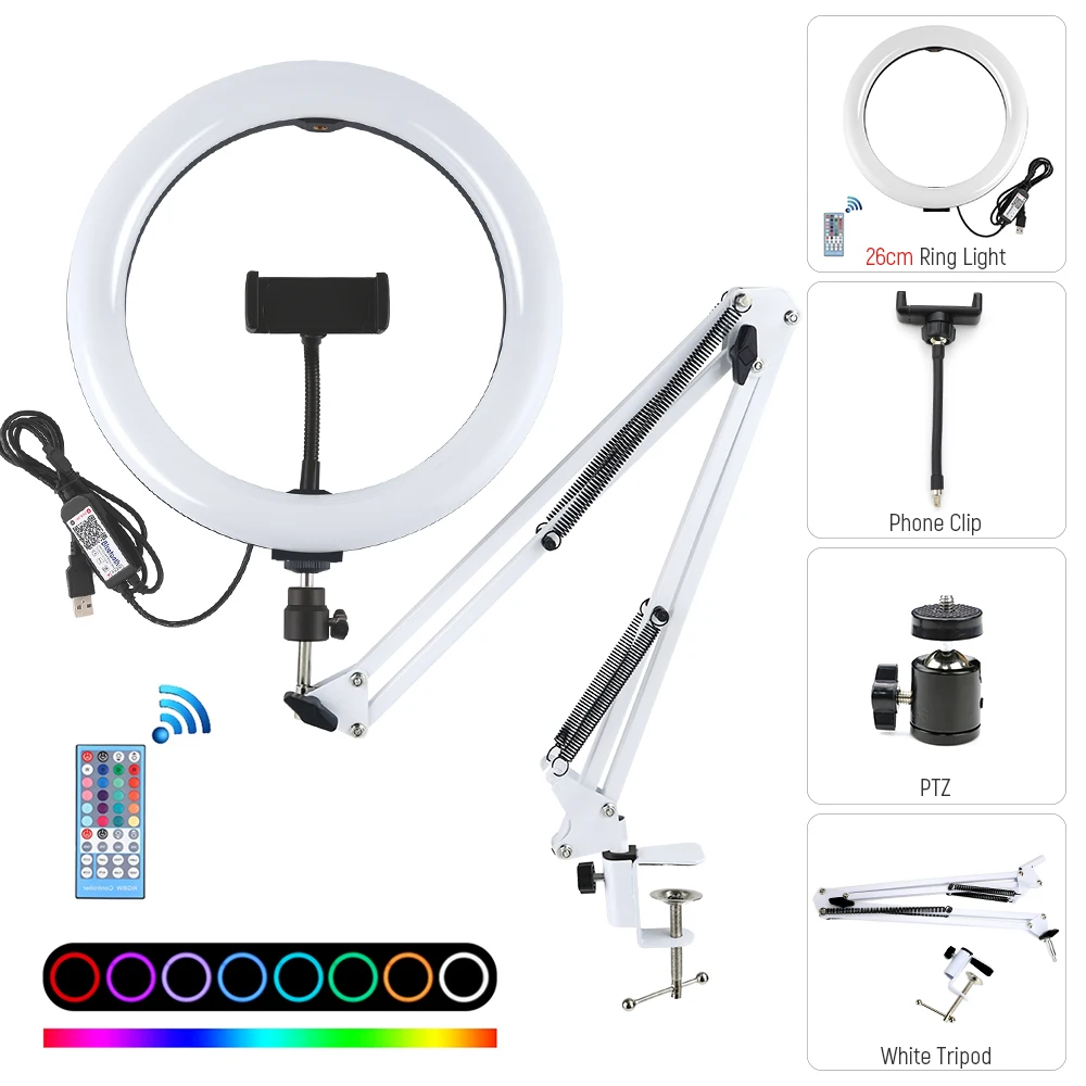Новый светодиодный кольцевой светильник для селфи RGB с белой длинной стойкой для стола, держатель для телефона с регулируемой яркостью, светильник для фотографии на Youtube
