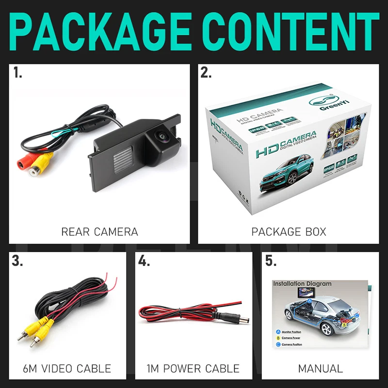 1. CVBS/AHD камера заднего вида2. Коробка для посылка3. Видео кабель 6 м4. Кабель питания5. Руководство пользователя