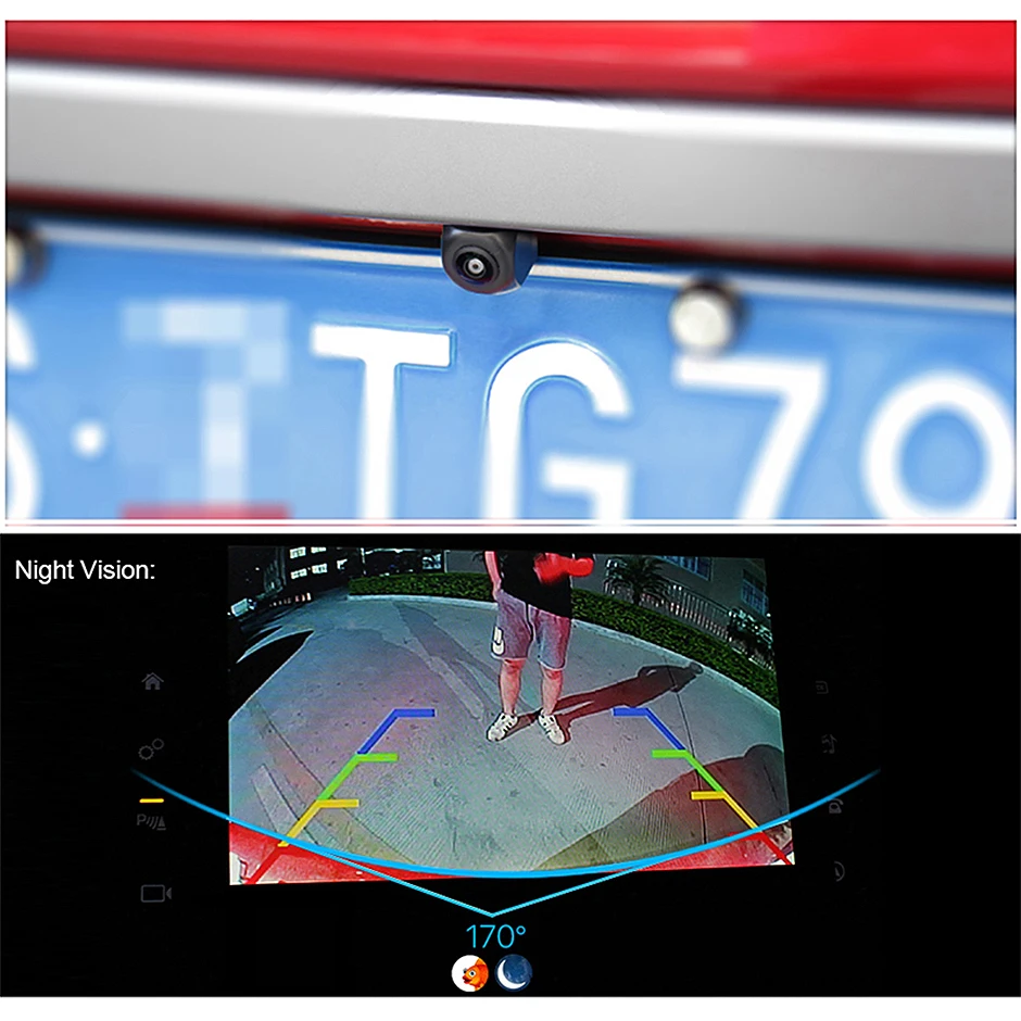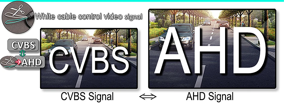 Через управление видеосигналом, он может поддерживать CVBS и AHD дисплеи сигнала.• Камера "CVBS720P-AHD720P": ( CVBS )→ Вырежьте белый экран →( AHD)• Камера AHD1080P:(AHD1080P 1920x1080 175 ° )→ Отрежьте белый экран →( CVBS 1280x720 125 °)