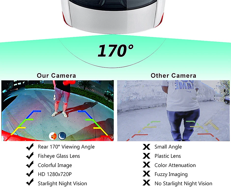 • Реальный угол обзора 170 °. Дисплей выглядит как рыбий глаз, стеклянные линзы, с широким поле зрения, опасные слепые пятна являются вещью прошлого.