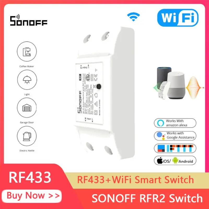 Радиочастотный переключатель Sonoff-это версия Sonoff с модулем радиочастотного приемника 433,92 МГц внутри. Этот беспроводной переключатель можно использовать вместе с пультом дистанционного управления RF, что позволяет Управлять приборами в помещении. Переключатель дистанционного управления позволяет пользователям удаленно включать/выключать подключенные устройства через приложение EWeLink из любой точки мира.
