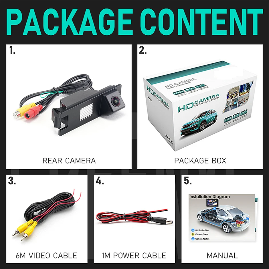 1. CVBS/AHD камера заднего вида2. Коробка для посылка3. Видео кабель 6 м4. Кабель питания5. Руководство пользователя