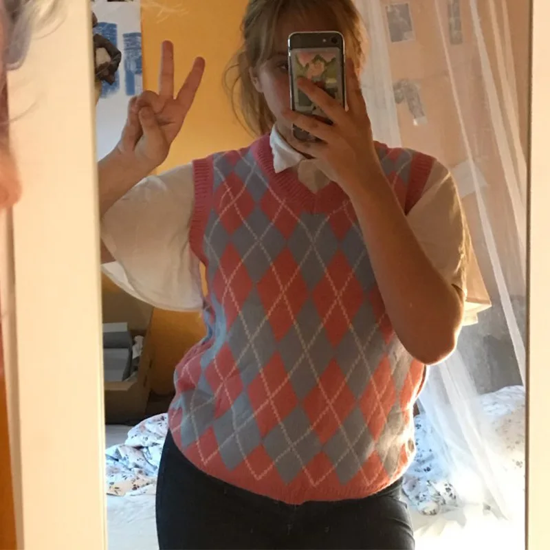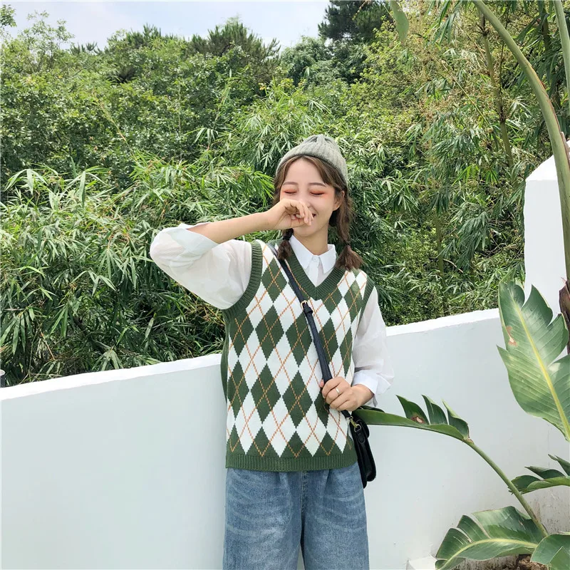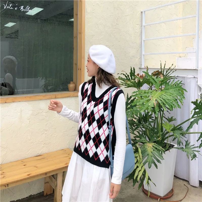 Женский вязаный жилет с узором ромбиками, Повседневный пуловер в Корейском стиле, эластичный свитер, безрукавка с V-образным вырезом на осень и зиму