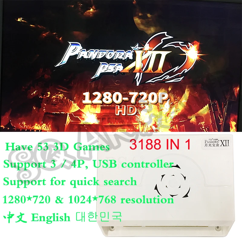 3D Пандора доска 12-3188 в 1(38 3D игр)* 3188 игр в свободном режиме (38 3D игр)!* Китайский Упрощенный. Китайская традиционная. Английский. Корейский регулируемый.* Поддержка быстрого поиска. Последние игры* Разрешение 1280*720 и 1024*768* Пауза в производстве игр* Более захватывающе, ждем, когда вы обнаружите-Поддерживает геймпад 2usd в свободной игровой моделиСпецификация:-Игры: 3188 игр-Материал: пластикРуки классических аркадных игрРазрешение видео 1280*720 и 1024*768С 3188 играмиВыход VGA + HDMI (не поддерживает трубку cga)Мощность: 110-220 В