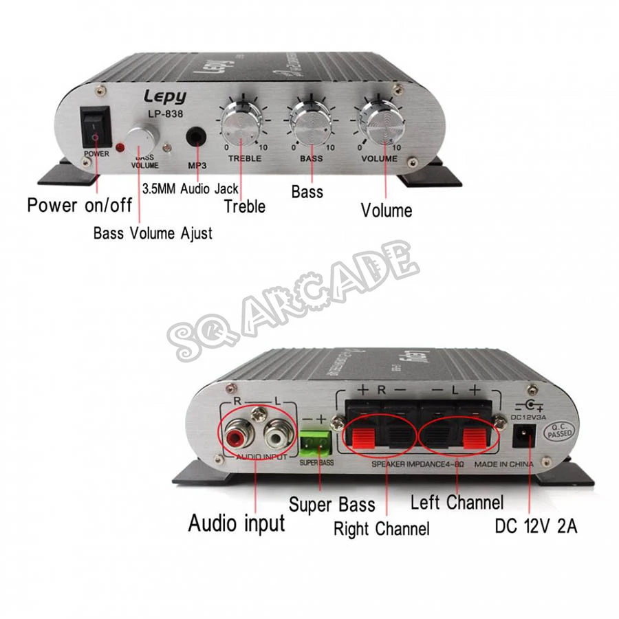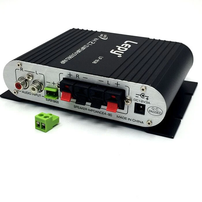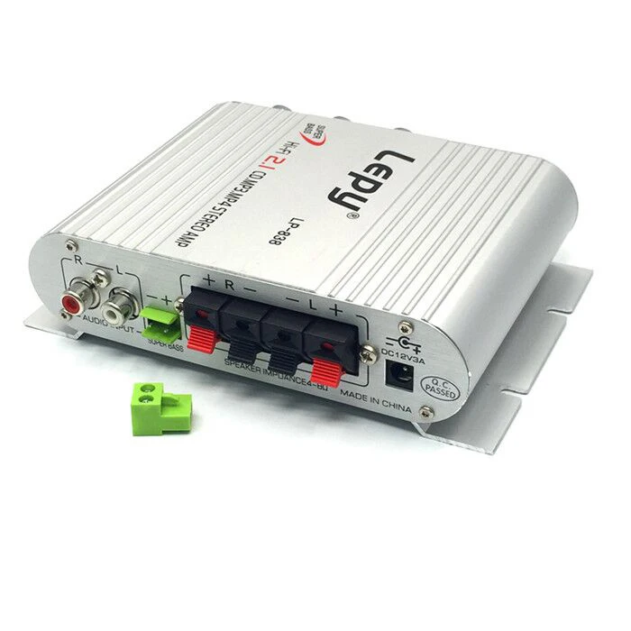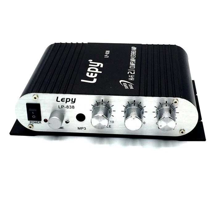 Новое поступление Lepy LP-838 2,1 Chnnel цифровой стерео аудио усилитель мощности мини Hifi авто звук с сертификатом CE для аркадной игровой машиныОсобенности:Поддерживает как L/R RCA, так и 3,5 мм стерео-входы.3 выходной канал, высокое качество стерео звук и тяжелый бас-выходВыключатель питания, с usb-портом для MP3,MP4 зарядкиВысокие частоты, басы, баланс, регулятор громкостиВес и прочный алюминиевый светильникХарактеристики:Модель: Lepy LP-838Вход постоянного тока: 12V ~ 18В, 2AАудио вход: L/R RCA или 3,5 мм стереоS/N: 75 дБОбщее гармоническое искажение: <0.4%Цвет: черный и белыйИскажение: <0,1 (1 кГц)Сертификат: CEЧастотная характеристика: 29-18 кГцМощность напряжение: DC 3-5A, 12-14,4 VВыходная мощность: RMS 15 Вт x 2 + сабвуфер 20 Вт x 1 (на входе 12DC)Применение (подходит для):Шкаф для аркадных игрМикрофонКомпьютерДомашний андиоМобильный телефонДинамикМотоциклАвтомобильКлассДля активного отдыхаВсе машины нуждаются в усилителях и т. Д.