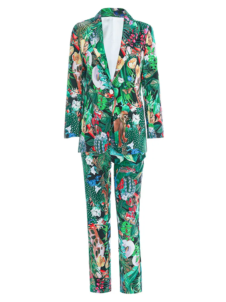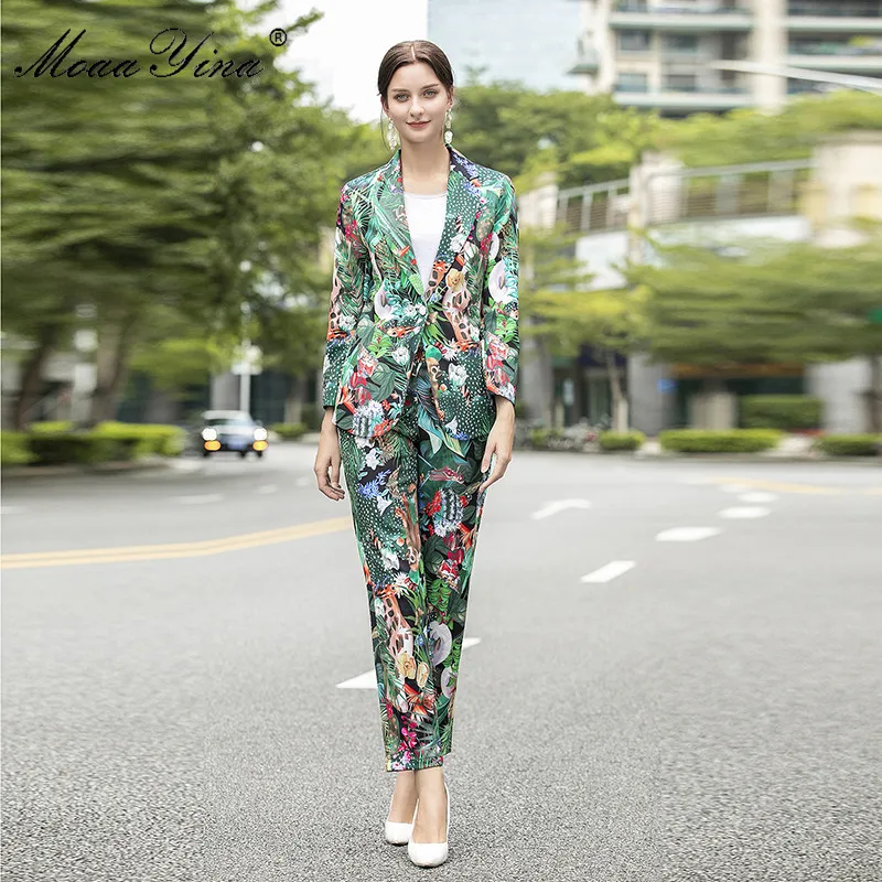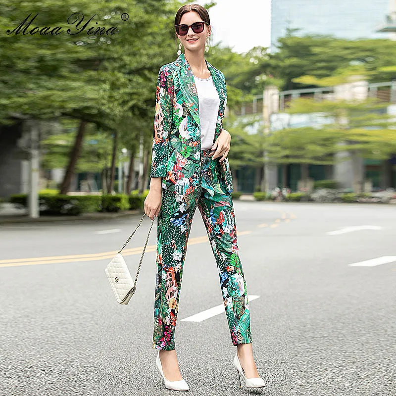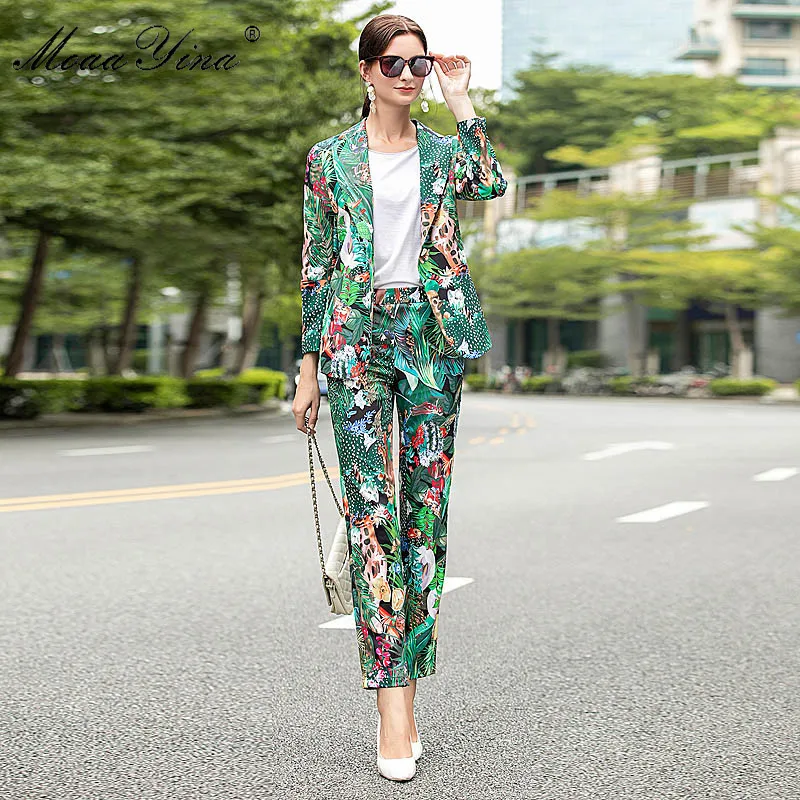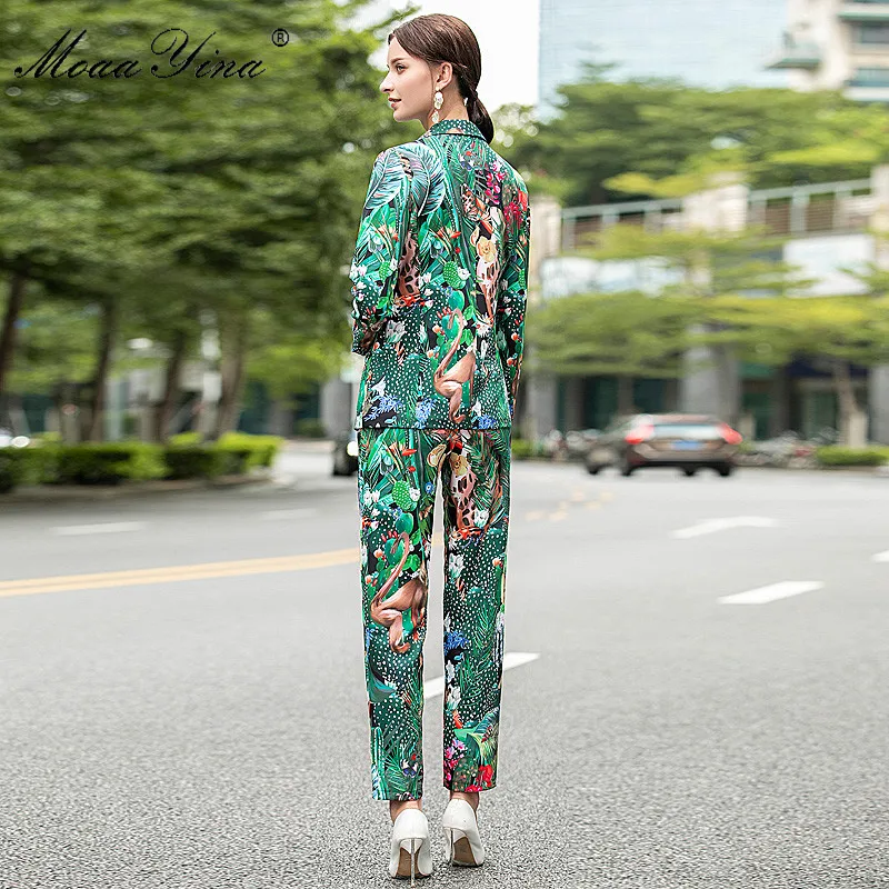 Женский Дизайнерский Костюм MoaaYina, комплект из двух предметов: Топ с длинным рукавом и брюки с принтом обезьяны и зеленых листьев и кактусов, весна-осень