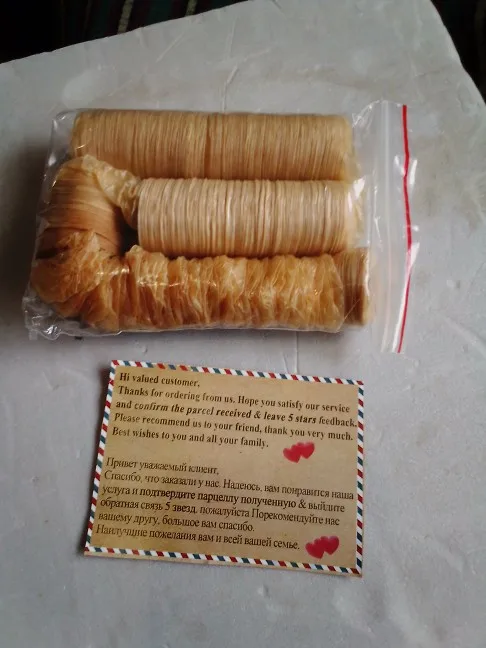 Спасибо продавцу! Оболочка пришла за месяц в Пермь. Брала с купоном за 160 рублей. Сухая ничем не пахнет, выглядит симпатично))). Никогда не пробовала готовить колбасу в такой оболочке...сначала посмотрю видео, думаю на Ютубе полно такого. Насадки на мясорубку ещё в пути, Вообщем подготовлюсь))))