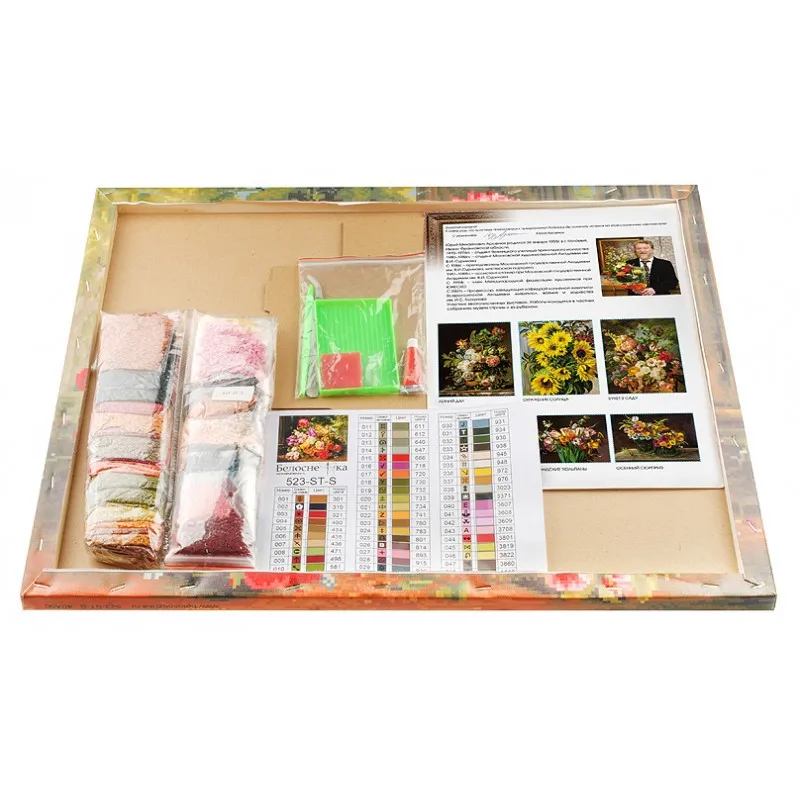 Набор из серии Алмазная мозаика на подрамнике от торговой марки «Белоснежка» наполнит ваши свободные часы увлекательным занятием. Полюбуйтесь цветочным натюрмортом в большом формате от художника Юрия Арсенюка и попробуйте сами создать такую уютную картину. Вы будете восхищены мерцающими и переливающимися деталями на свету!Основа работы – холст, на котором напечатана цветная схема с контрастными условными обозначениями, поверх нанесено клеевое покрытие и защищающая прозрачная плёнка. Используя прилагающийся металлический пинцет и комплект квадратных акриловых камней 2,5*2,5 мм, вы отлично справитесь с заполнением каждого участка картины. Постепенно заполняя ряды камешками, вы будете в восторге от высокой детализации изображения.Блестящее воспроизведение оригинала!Комплектация:1. Основа картины - холст с нанесенной схемой на подрамнике2. Комплект квадратных камней с огранкой 2,5* 2,5 мм.3. Пластмассовый лоток с ячейками4. Пинцет металлический5. Крепления для подвеса на стену6. Дополнительный тюбик клея7. Листовка-ключ к схеме8. Складной лоток из картона для хранения пакетиков с камнями9. Листовка о художникеХарактеристики:Художник- Юрий АрсенюкСерия - цветыРазмер – 40*50 см.Тип выкладки – 100% заполнениеФорма камней - квадратные 2,5*2,5 мм, 9 и 13 гранейКоличество цветов - 48Упаковка – картонная коробкаТорговая марка – БелоснежкаСтрана производства - Китай