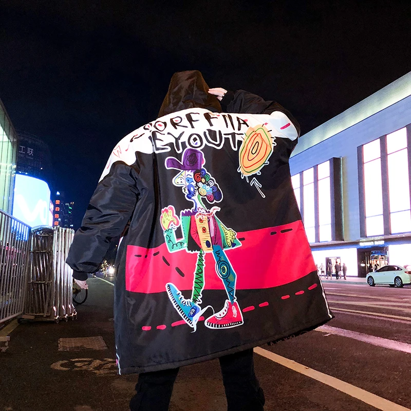 Куртка мужская Длинная зимняя в стиле Харадзюку, с принтом граффити