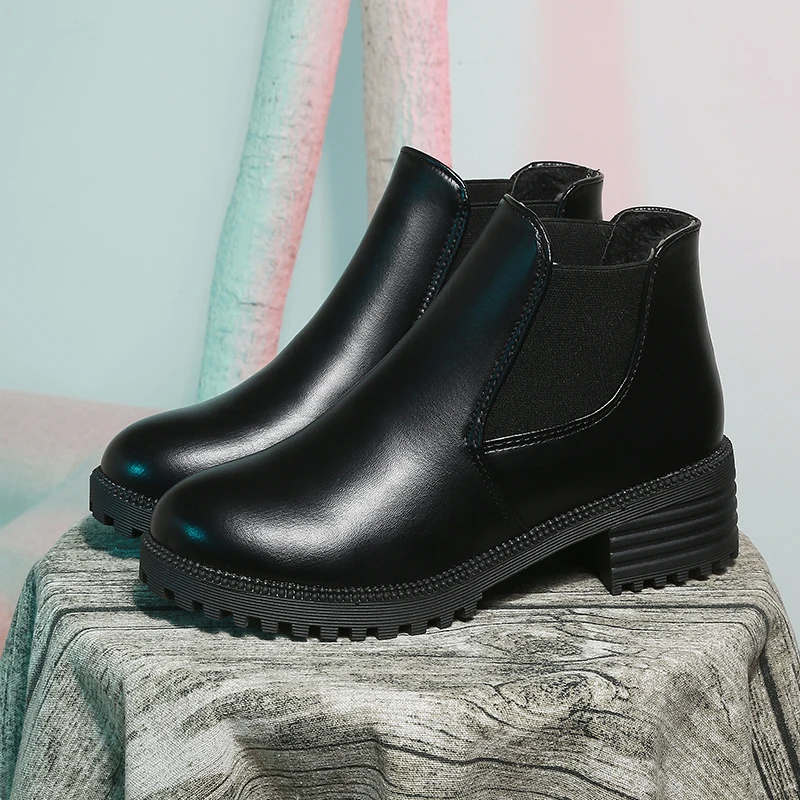 Женские ботинки в стиле панк, зимние кожаные ботинки челси на толстом среднем каблуке, с круглым носком, с эластичной резинкой, без застежек, с плюшевой подкладкой