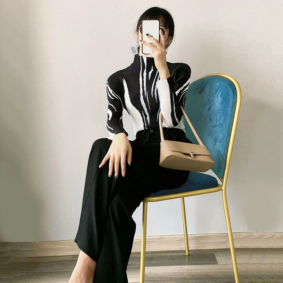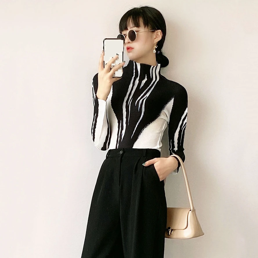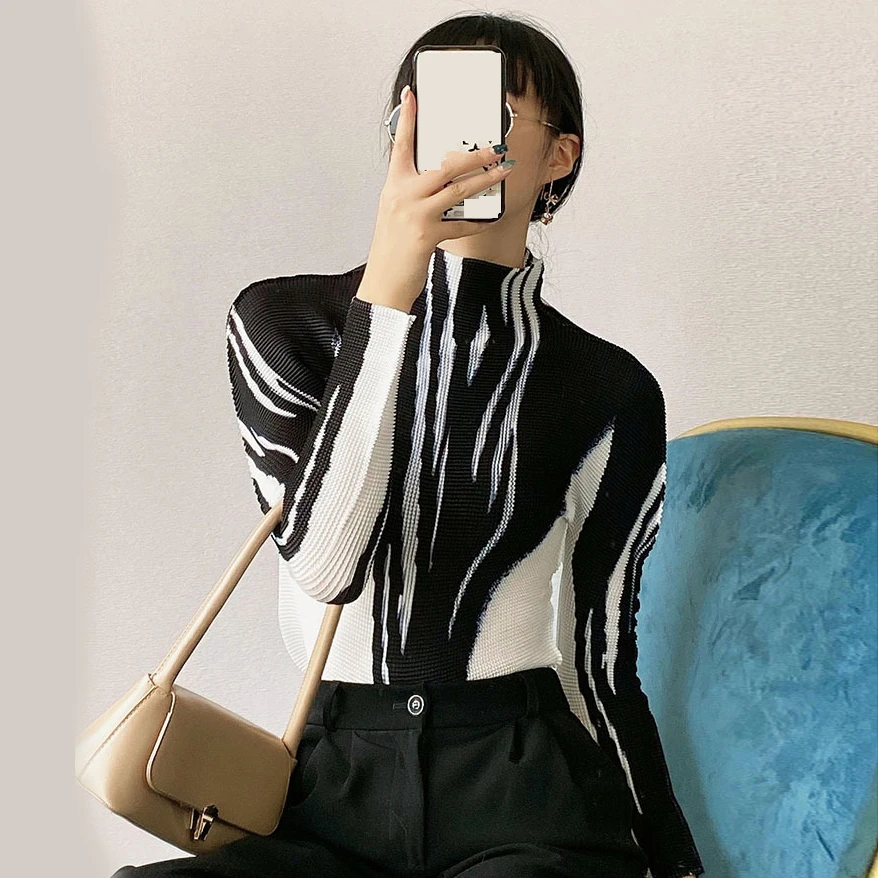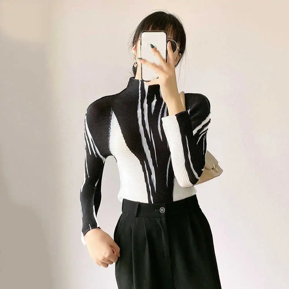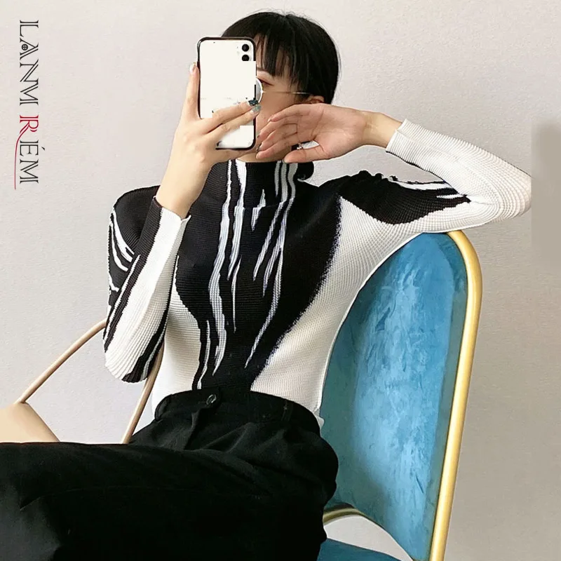 LANMREM черная и белая плиссированная легкая уличная одежда с длинными рукавами, топ 2022, Весенняя модная маленькая футболка для женщин 2A1552