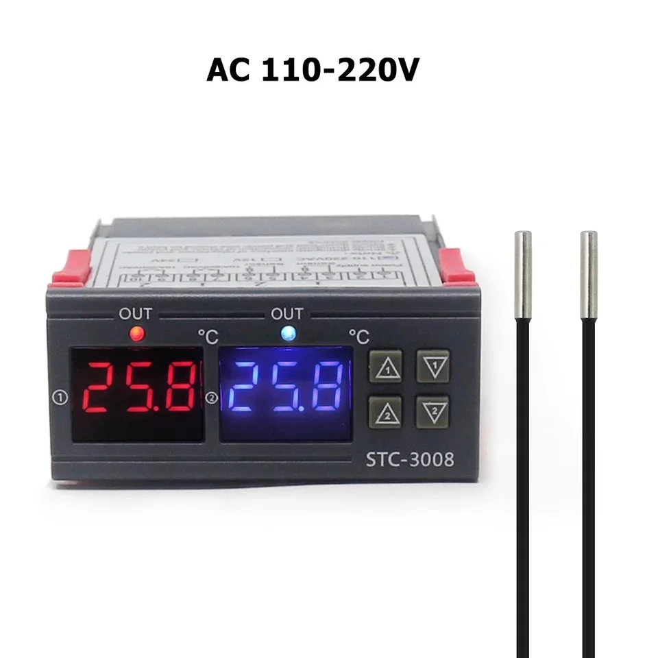 Двойной цифровой регулятор температуры STC-3008, реле на выходе 220 В, терморегулятор, термостат с нагревателем
