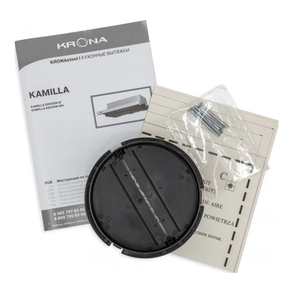Встраиваемая вытяжка Krona Kamilla 600 inox (2 мотора) работает просто идеально! Купить недорогую вытяжку для кухни мечтает каждая хозяйка. И некоторым из них удается сделать подобную покупку, не потеряв при этом в качестве продукции. В частности, речь идет о таком приобретении, как встраиваемая вытяжка Krona Kamilla 600 inox (2 мотора). С одной стороны, это высокофункциональное вытяжное устройство, которое оснащено парой мощных моторов и в два счета освободит кухню от запахов готовящейся или подгоревшей еды. С другой стороны, это вытяжка, реализуемая по невысокой цене, благодаря чему купить ее могут позволить себе даже люди с небольшим достатком. Основные режимы, доступные при эксплуатации данного изделия – это отвод воздуха из помещения и циркуляция воздуха. В отзывах потребителей, которые опробовали устройство в действии, говорится, что вытяжка отлично удаляет все запахи, создает неплохой приток воздуха извне. А за счет наличия в конструкции двух вентиляторов ее работа боле эффективна, чем у аналогов. Шумность вытяжки небольшая, максимум 56 децибел. Есть у нее и встроенная система освещения, представленная лампой накаливания. Вмонтировать встраиваемую вытяжку Krona Kamilla 600 inox (2 мотора) можно в любой подвесной шкафчик Удобство использования принудительной вытяжки от «Крона Камилла» заключается в том, что ее запросто можно спрятать в подвесной шкафчик, который имеется на любой кухне. Монтаж конструкции элементарен и его можно произвести даже собственными силами. В комплекте с данной моделью поставляется два фильтра, улавливающих жир. Имеется возможность дополнительно поставить угольный фильтр.