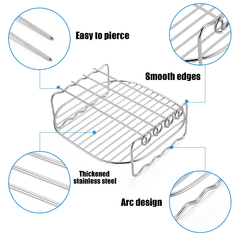 Особенности: 1. Наши аксессуары для фритюрницы изготовлены из пищевой нержавеющей стали марки 304, прочные и термостойкие, печь безопасна. 2. Двухслойная стойка для более универсальных рецептов фритюрницы. Максимизируйте нагревающую поверхность пищи, используйте Шпажки для шейша кабоба на верхнем слое и другие продукты на слое решетки. 3. Не прилипает и не ржавеет высококачественная нержавеющая сталь, легко моется, каждая воздушная фритюрница аксессуары безопасна для посудомоечной машины для быстрой и беспроблемной очистки, просто проскользните в посудомоечной машине и получите ваши руки бесплатно. 4. Край стойки отполирован до гладкой поверхности без шероховатого пятна, Защитите вашу руку при стирке или удержании. 5. Плотная параллельная линия предотвращает падение пищи. Параметры: Семидюймовый Размер гриля: 17,2*7,2 см Четыре выпечки контакты: 17,5 см Семидюймовые высокий Пароварка: 17,5*5 см Plate rack: 15,5*8,5 см Материал: нержавеющая сталь Обратите внимание: 1. Из-за различных настроек монитора и светильник эффект, фактический цвет изделия на фото может быть s светильник ly отличается от представленного на фотографиях. 2. Возможны отклонения на 1-3 см вследствие измерений вручную.