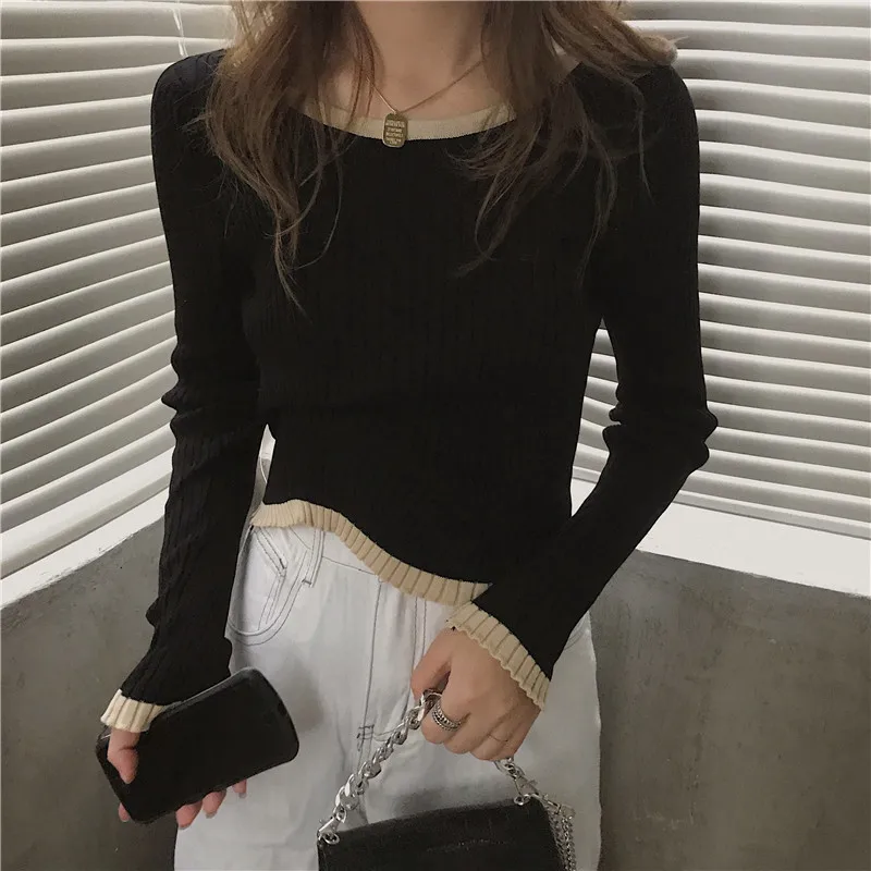 Свитер-пуловер Женский Осенний Простой Трикотажный облегающий топ с круглым вырезом и длинным рукавом модный лоскутный Универсальный женский топ для отдыха