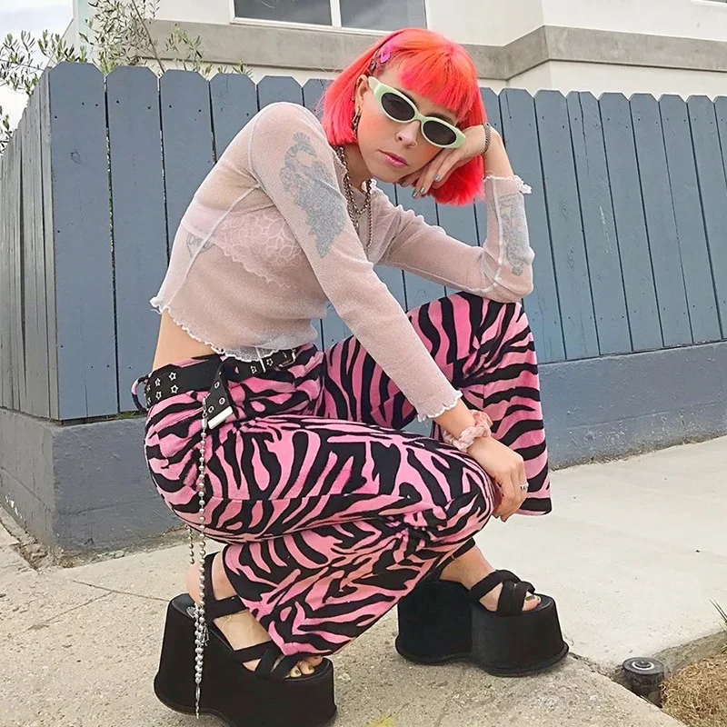 Эстетика, розовые длинные штаны с принтом зебры прямые брюки в стиле панк для девочек, прямые брюки со средней талией, 90s, уличная одежда