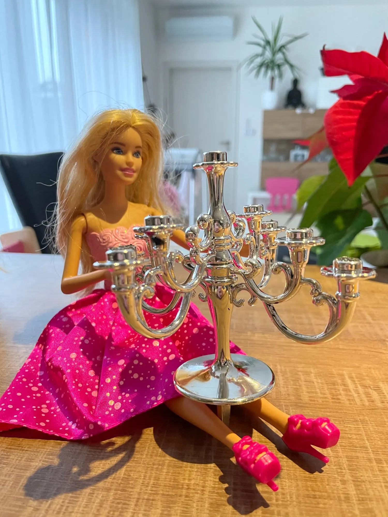 для Барби великоват, больше подойдет для кукол 1/4 или 1/3. Это украшение для торта, поэтому подсвечник идет на ножке, но её легко отрезать. Материал пластик. Свечи в комплекте.