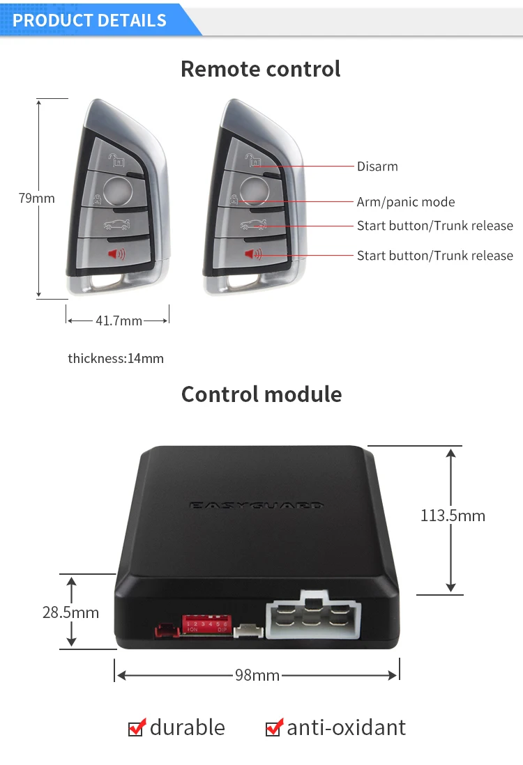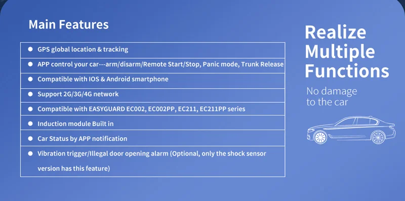 Это автомобильная сигнализация EASYGUARD PKE с GPS-отслеживанием, пассивным входом без ключа, удаленным запуском, push-стартом, сенсорный ввод пароля. Этим товаром можно управлять со смартфонов IOS и Android.