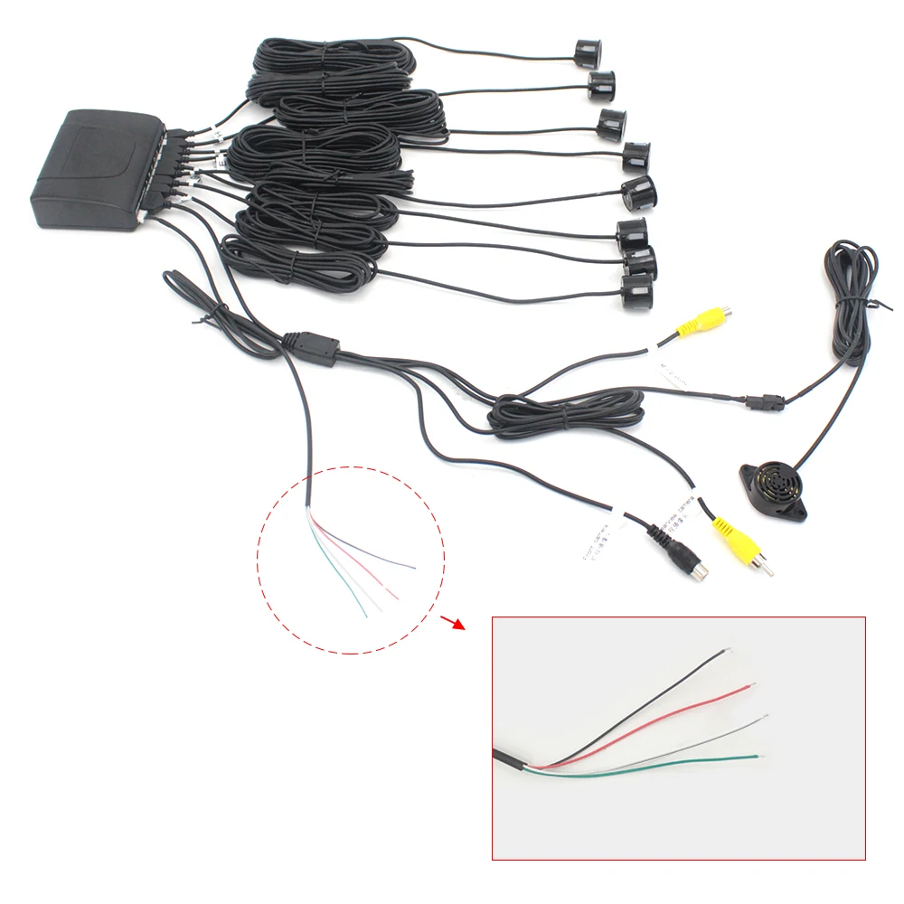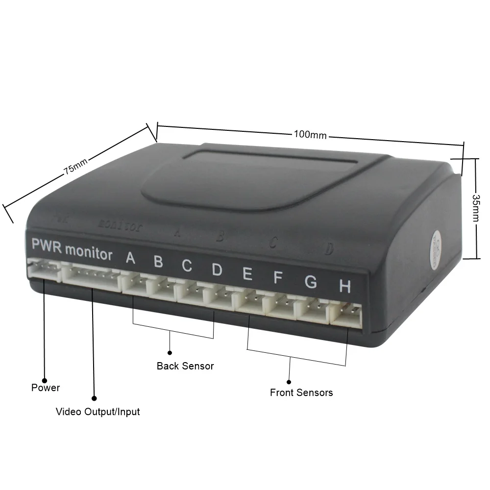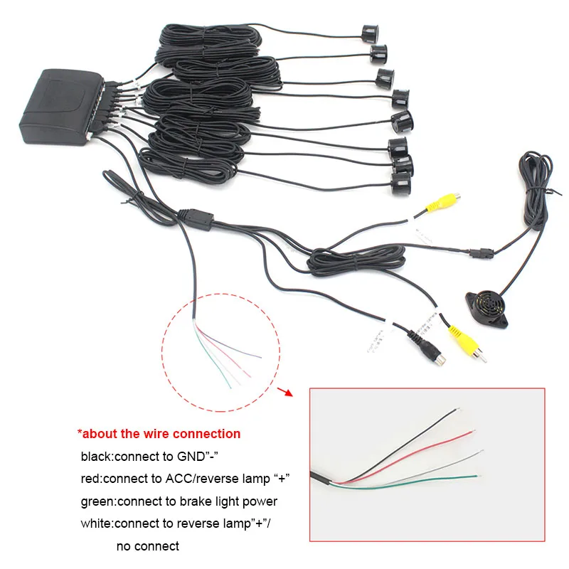 Особенности:(1) поддерживает все функции самостоятельного тестирования датчика парковки(2) отображение реального изображения и расстояния препятствий на экране(3) Левая и правая Указатели направления, звуковой сигнал на расстоянии(4) заднее расстояние обнаружения составляет от 0,4 м ~ 2,5 м(5) Передняя расстояние обнаружения составляет от 0,3 м ~ 0,8 м(6) двусторонний видеовход камеры, односторонний композитный видеовыходХарактеристики:Номинальное напряжение: DC12VРабочий диапазон: 10,5 V-16VНоминальный ток: 40 ~ 800 мАРасстояние обнаружения: 0,40 М ~ 2,5 м (сзади)/0,3 м ~ 0,8 м (спереди)Ультразвуковая частота: 40 кГцРабочая температура:-40C ~ + 80C (по Цельсию)Упаковочный лист:1 х Основная коробка для автомобиля 4/6/8-Sensor1x звуковой динамик1x композитный видео кабель1x1,5 метра кабель RCA1x Шнур Питания1x Holesaw (диаметр 22 мм)* Замечено *Эта система визуального парковочного радара с 8 датчиками требует 2 камеры (спереди и сзади) и монитораКамеры и монитор являются дополнительными, вы должны купить их отдельно.