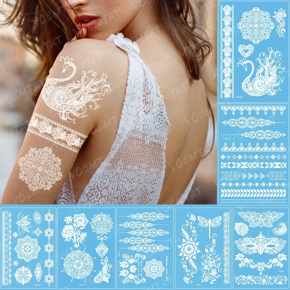 Переводные Временные Тату Женские Татуировки Водостойкая временное тату наклейка белые Временные татуировки индийская хна с кружевным лебедем и татуировки золотого и серебряного для невесты на высоких каблуках, женские