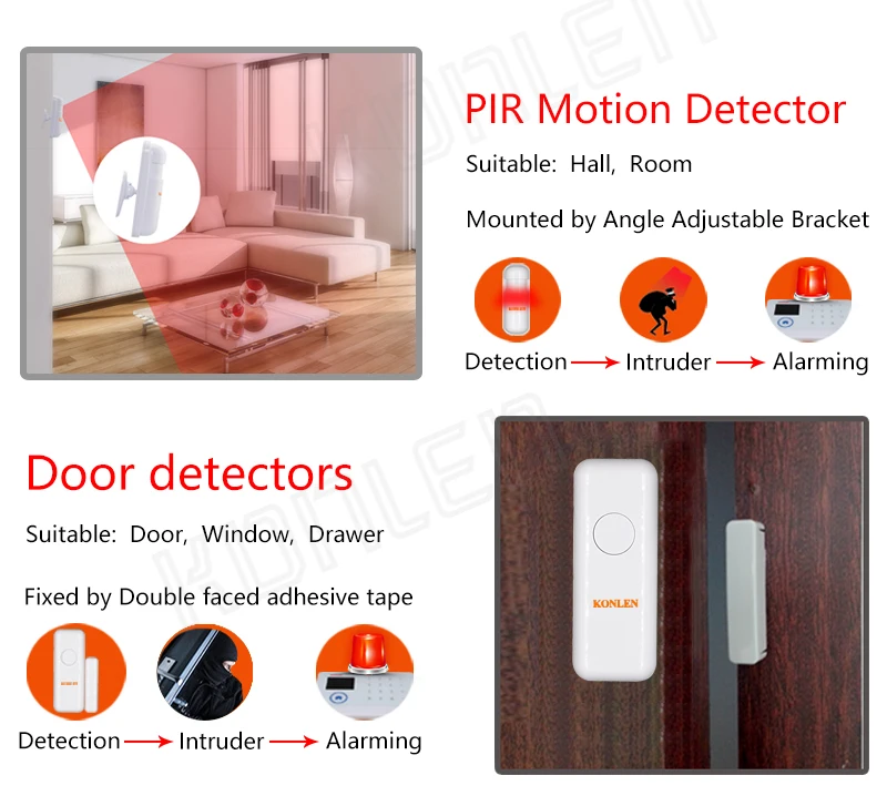 Перед использованием, пожалуйста, убедитесь, что выключатель питания датчиков движения PIR включен. Высота установки составляет около 2,2 метров над уровнем земли.Когда воры проходят через Область обнаружения, PIR детектор активируется для передачи беспроводного сигнала на панель сигнализации. Тревожная система.Магнитный дверной датчик окна двери:Дверной датчик используется для обнаружения закрывания и открытия двери, и состоит из передатчика и магнита двух частей. Его можно установить на двери, окна или любой предмет, который можно закрыть и открыть. Когда передатчик отделен от магнита, датчик двери отправит сигнал тревоги на панель сигнализации, система сигнализации будет оповещать.