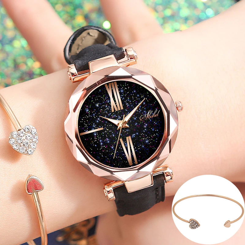 Кожа звездное небо женские часы комплект 2 шт. световой указатель женские часы в римском стиле платье для наручных часов повседневные zegarek damski