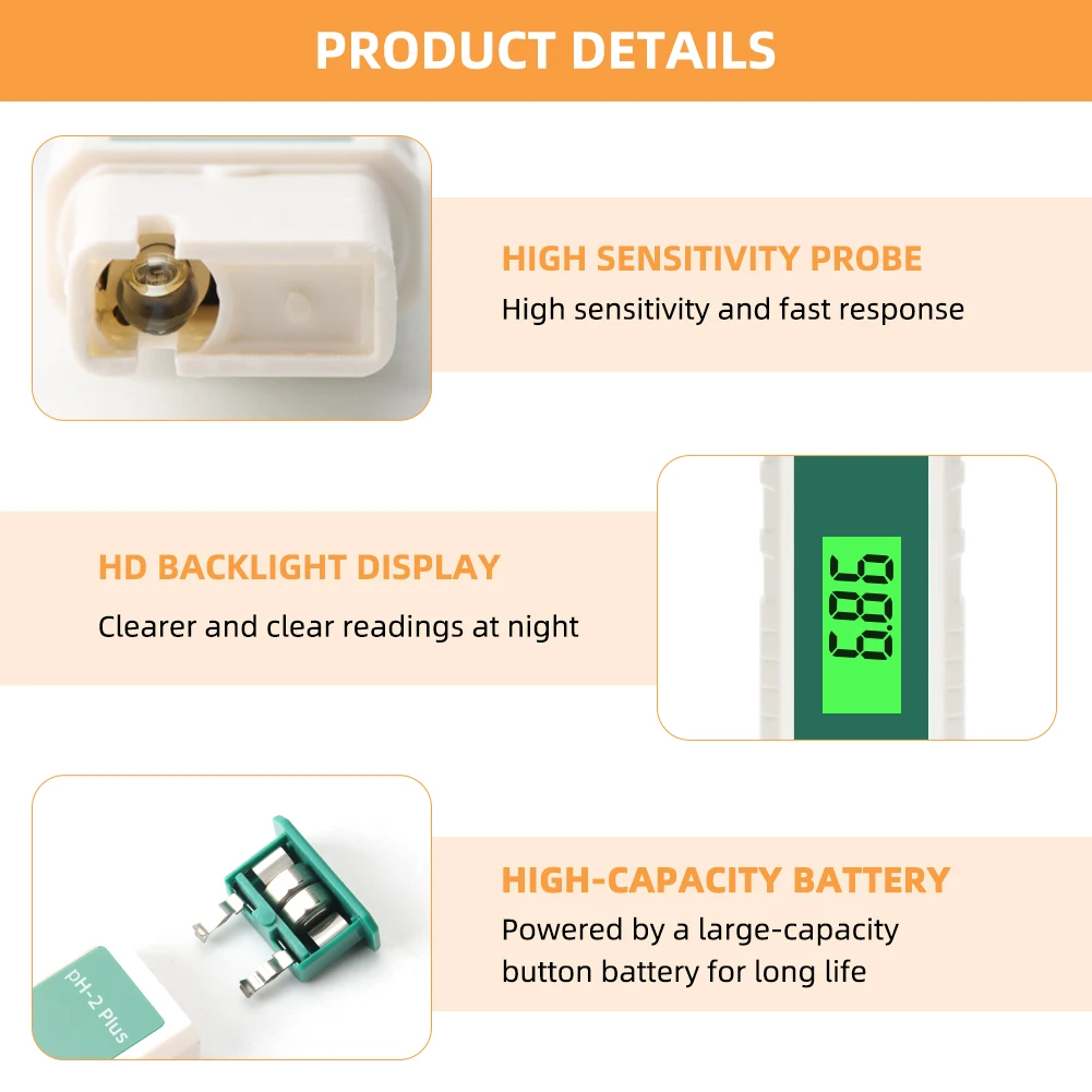 Ph-метр PH-2 Pro Plus-это недавно разработанный ph-метр, который похож на лакмусовую бумагу с изменяющимся цветом дисплеем с подсветкой. Он прост в использовании. При погружении в измеряемый раствор считывание может быть быстро отображено на ЖК-дисплее и автоматически откалибровано. Просто нажмите калибровку можно завершить одним нажатием кнопки. Не нужно использовать цветную карту и тестовую полосу, чтобы отличить значение pH, быстро и точно. Мини портативный. Широко используется, это идеальный инструмент для любого аквариума, рыболовства, бассейна, спа, школьной лаборатории, еды и напитков, питьевой воды и т. Д.