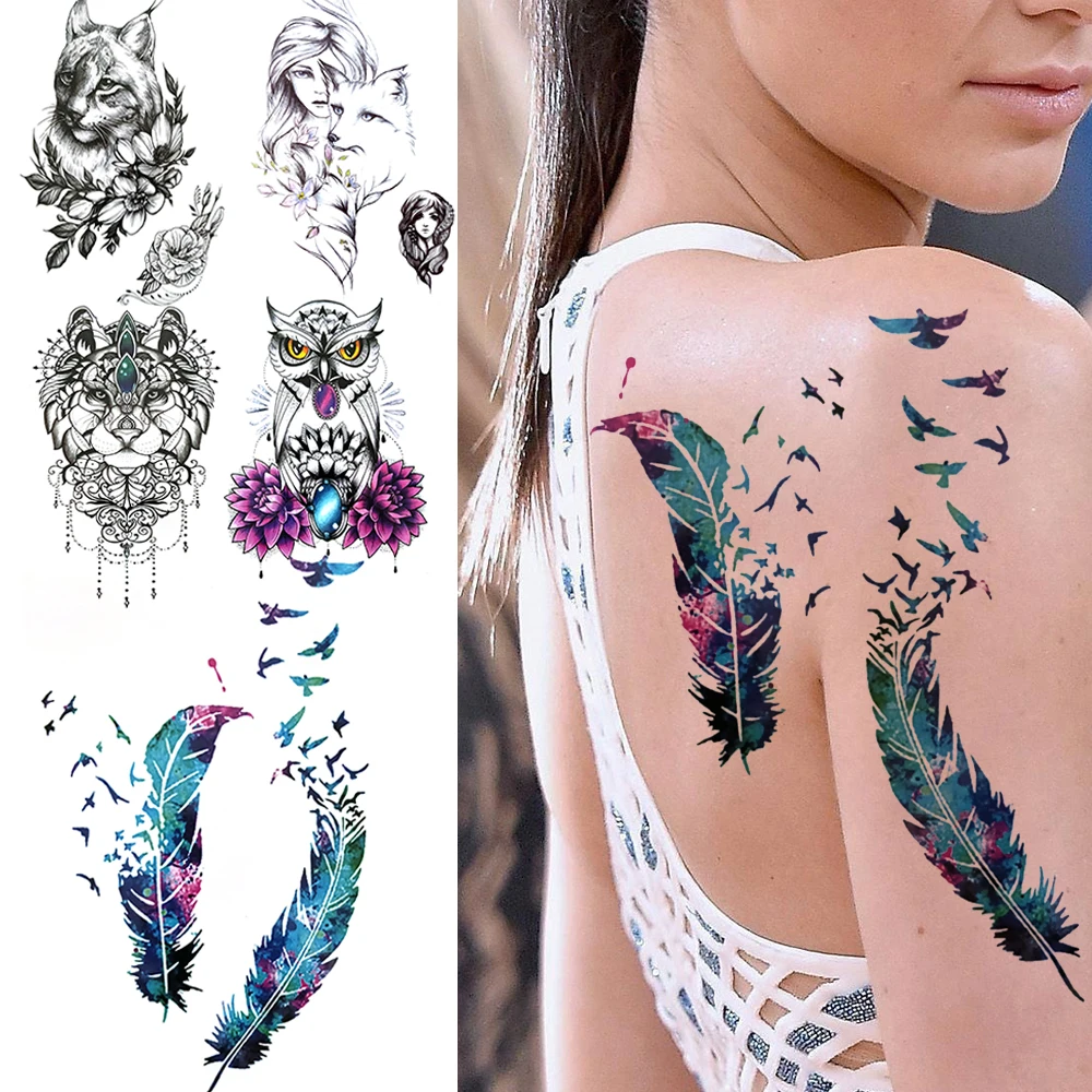 Тату временные Акварельные Перья птицы для женщин и девушек Реалистичная искусственная тату птица Сова Лев лиса наклейка татуировка на руку бедра