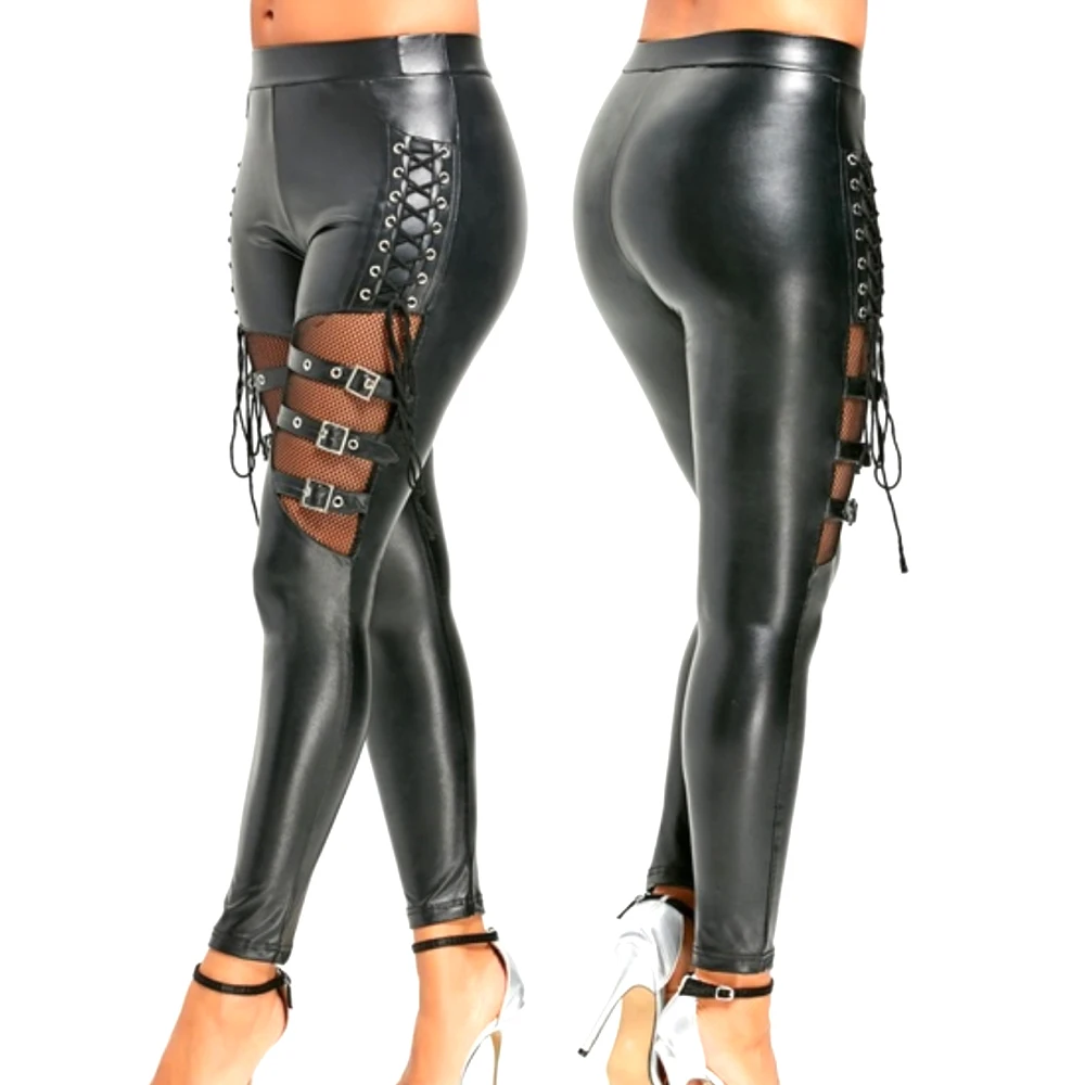 Сексуальные женские леггинсы из искусственной кожи на шнуровке, черные, с пряжками, ажурные, плетеные, из винила, блестящие обтягивающие леггинсы, облегающие экзотические штаны