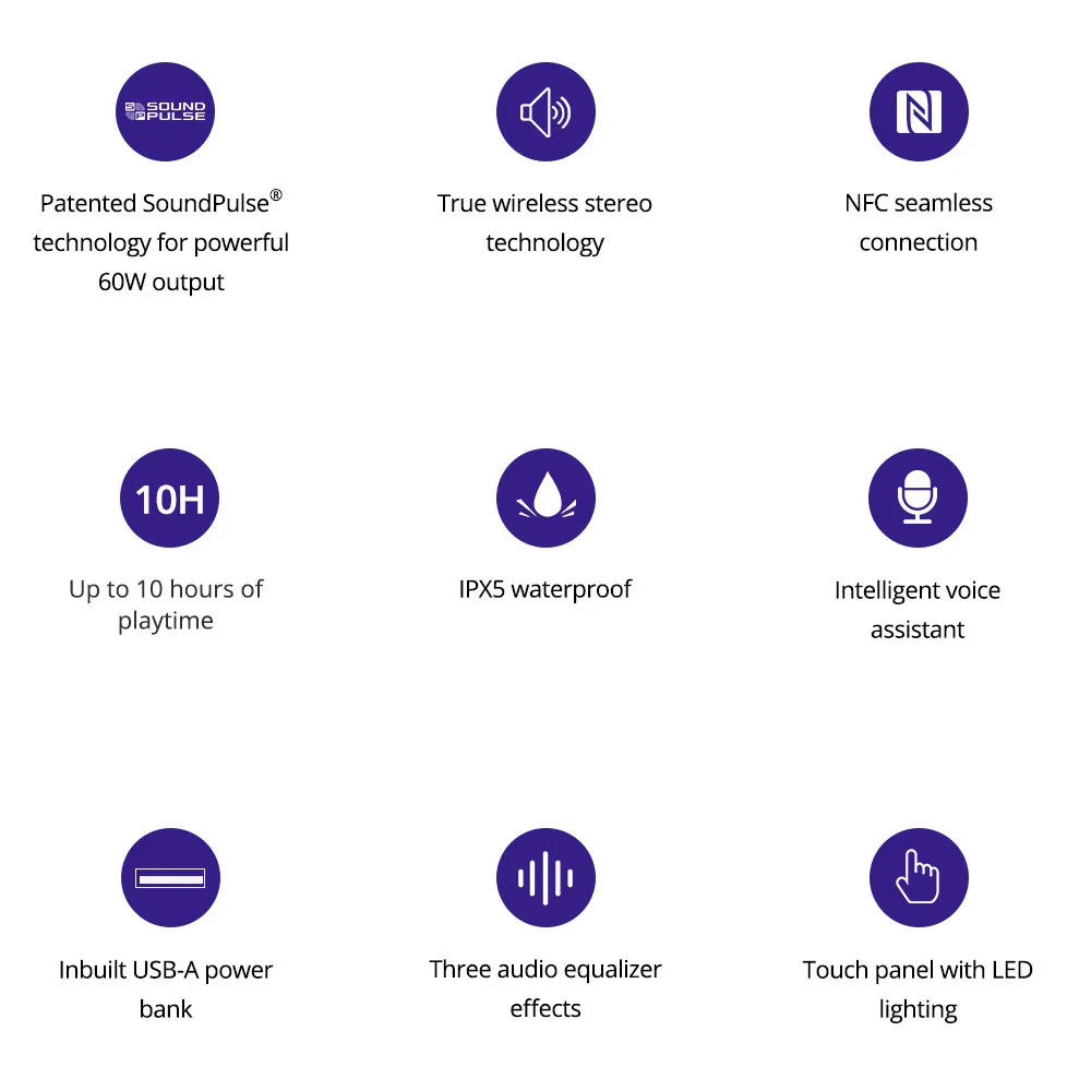 SoundPulse®ТехнологияНоминальная выходная мощность 60 Вт обеспечивает более четкое звучание. 2,1-канальный звук для стереозвука.