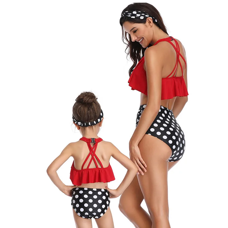 Одежда для плавания для родителей и ребенка Женский комплект бикини из 2 предметов с оборками, бикини с высокой талией, одинаковые комплекты для мамы и дочки купальный костюм, 2021