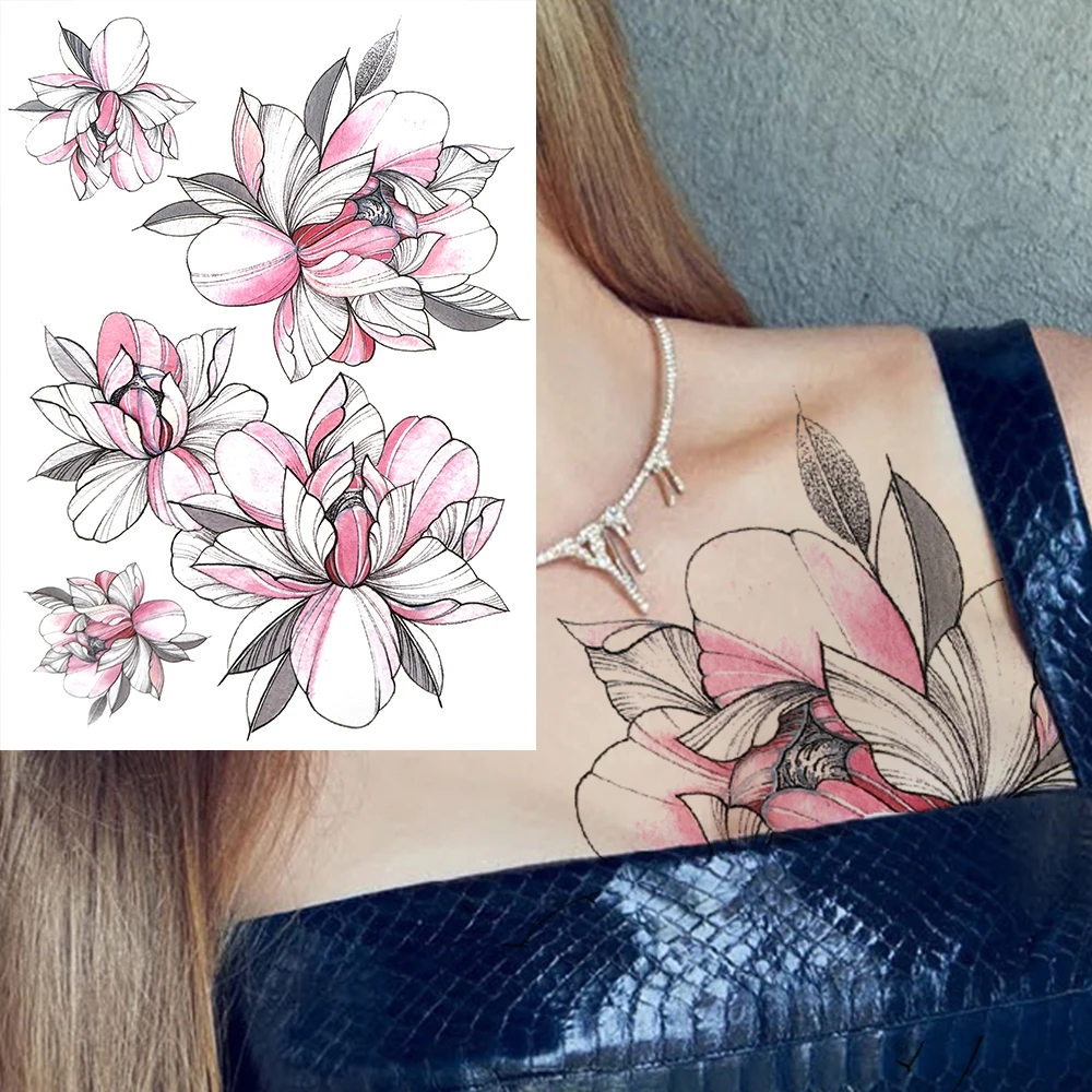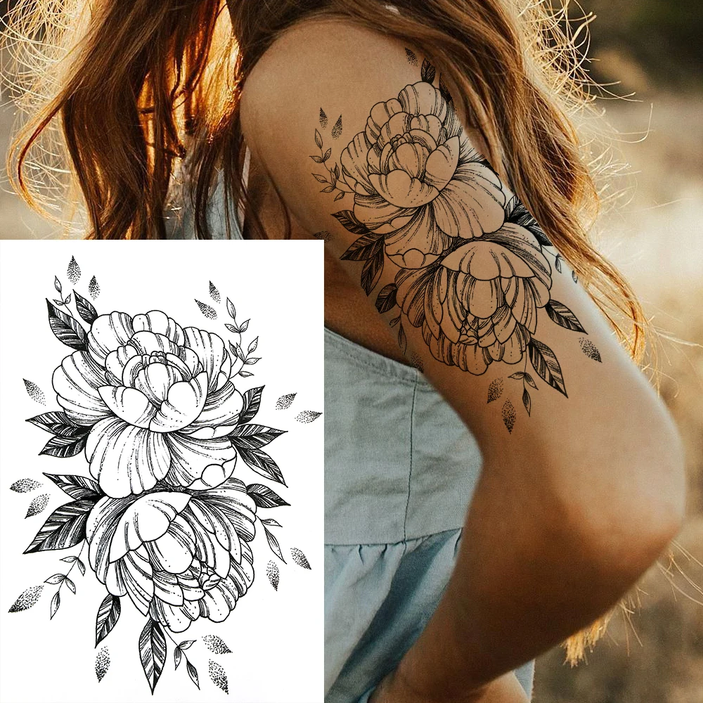 Большой цветок пиона, луна, временные татуировки для женщин и девуш...