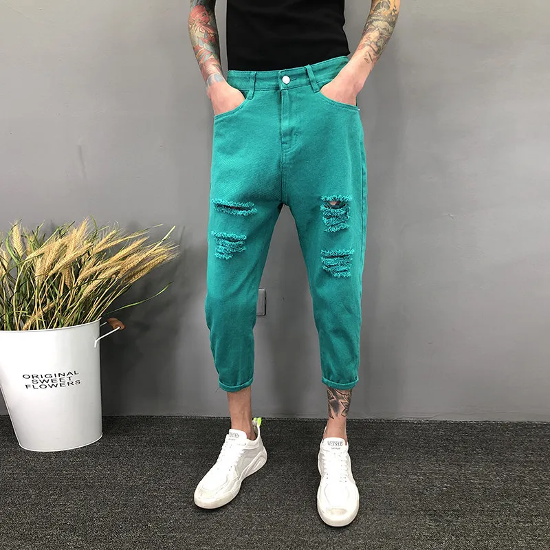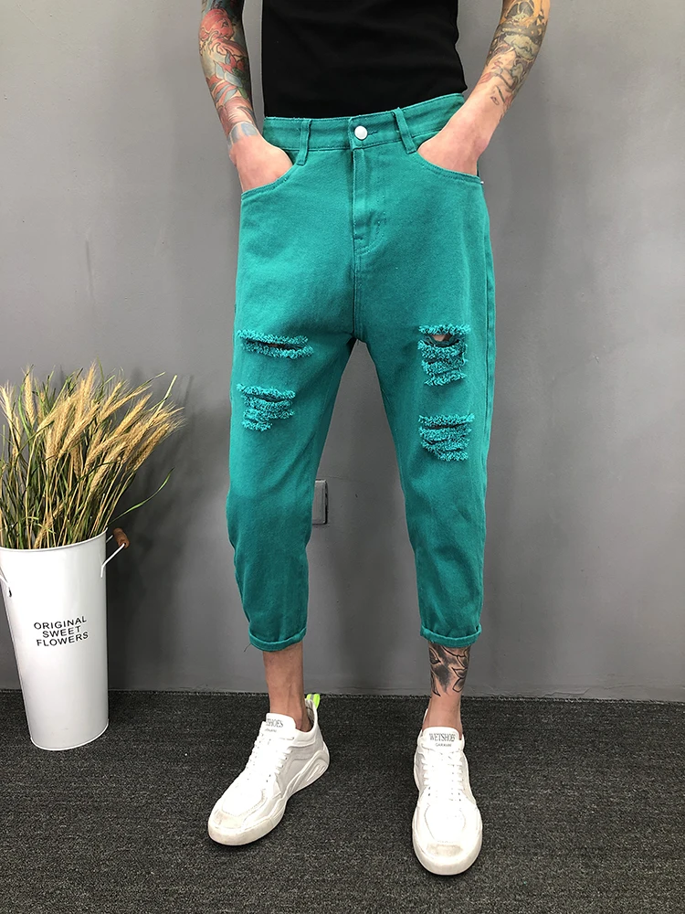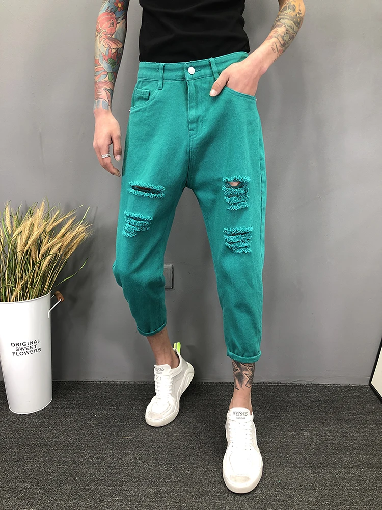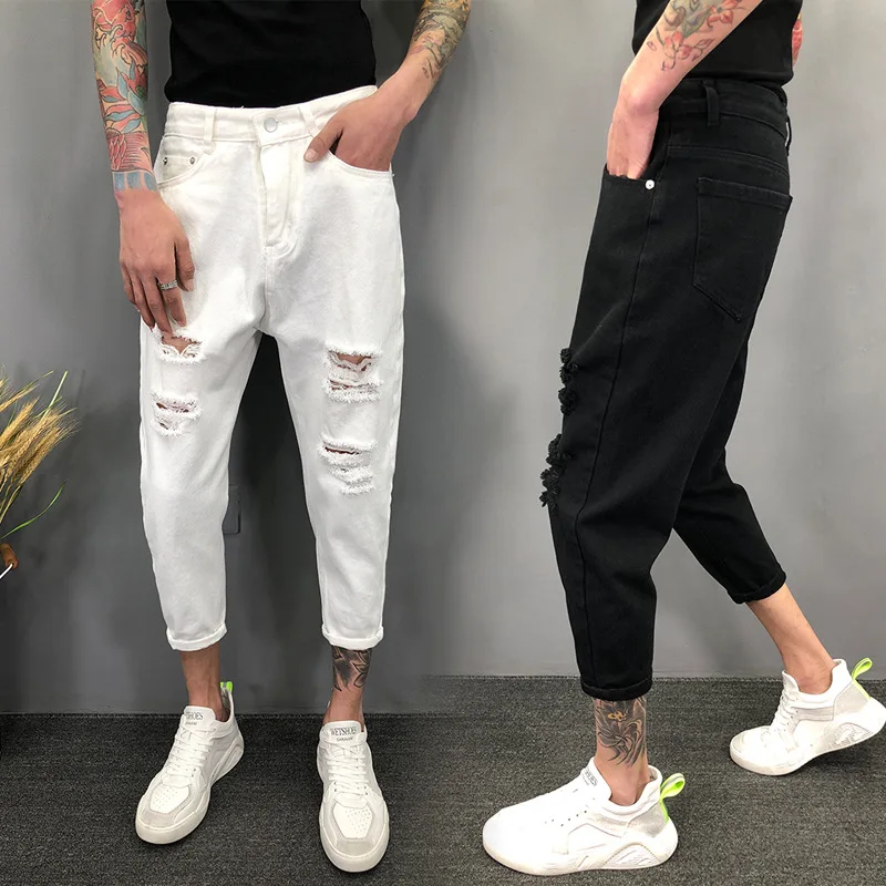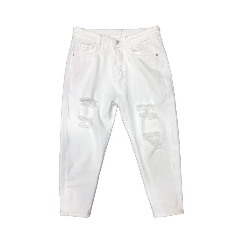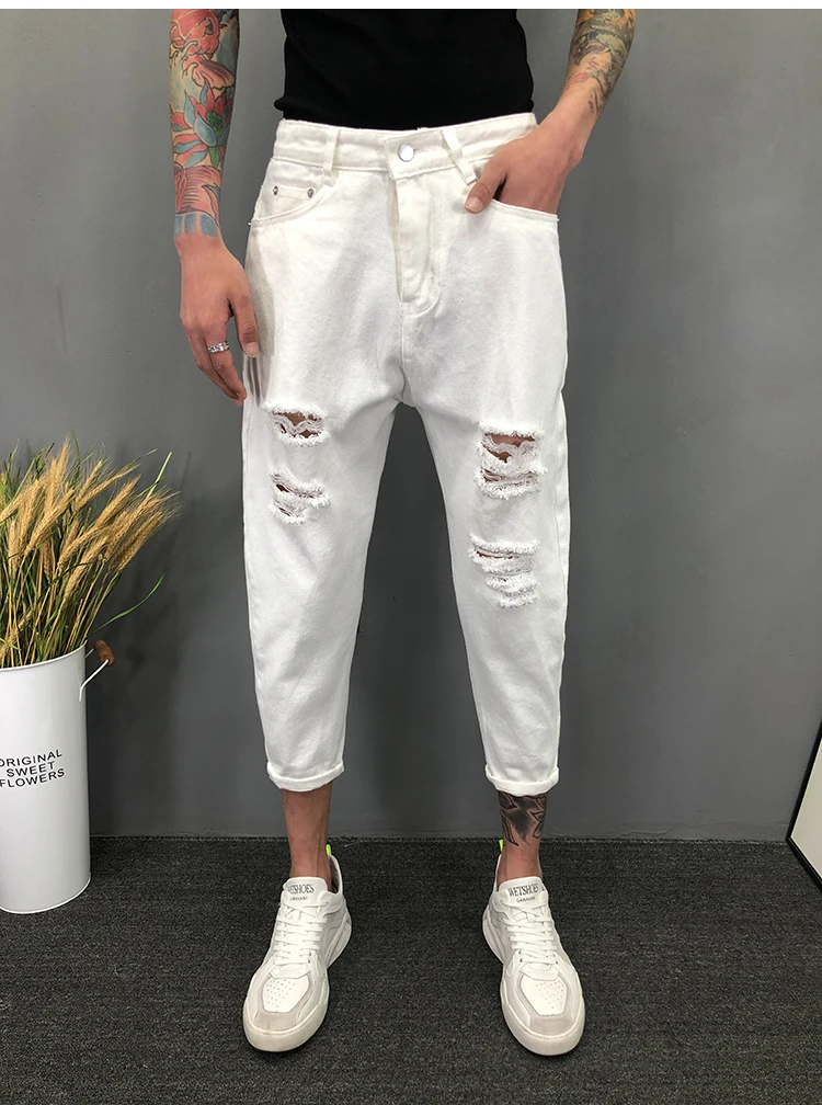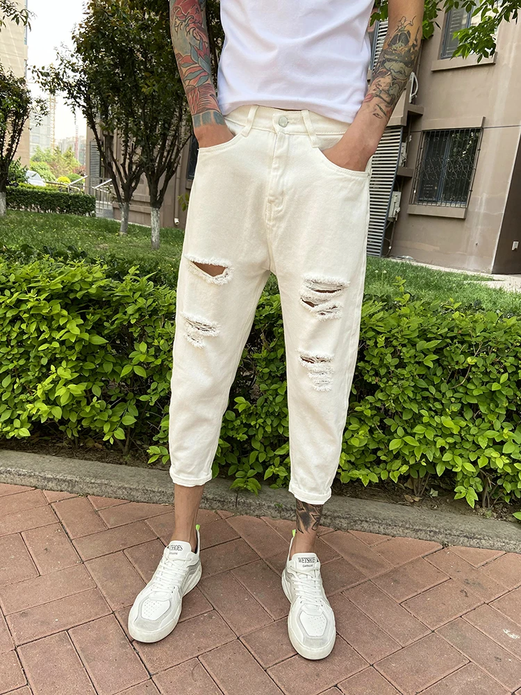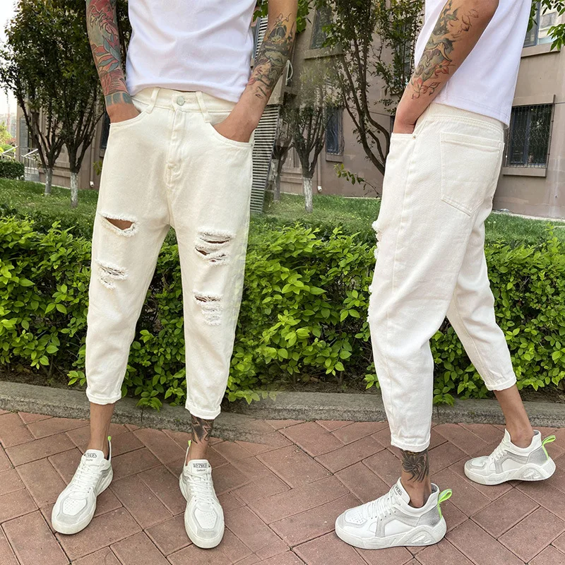 Новинка 2022, белые рваные джинсы с дырками, мужские летние тонкие свободные подростковые джинсы, брюки для ног, свободные шаровары