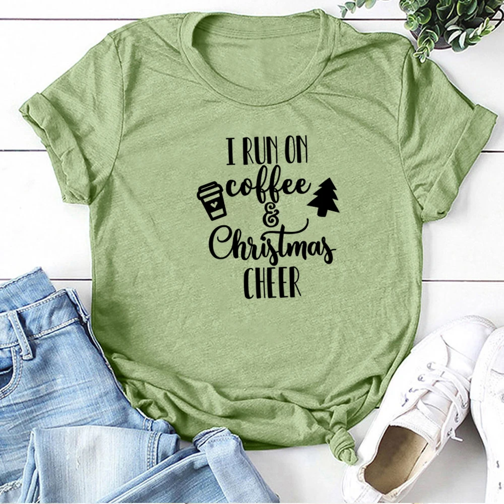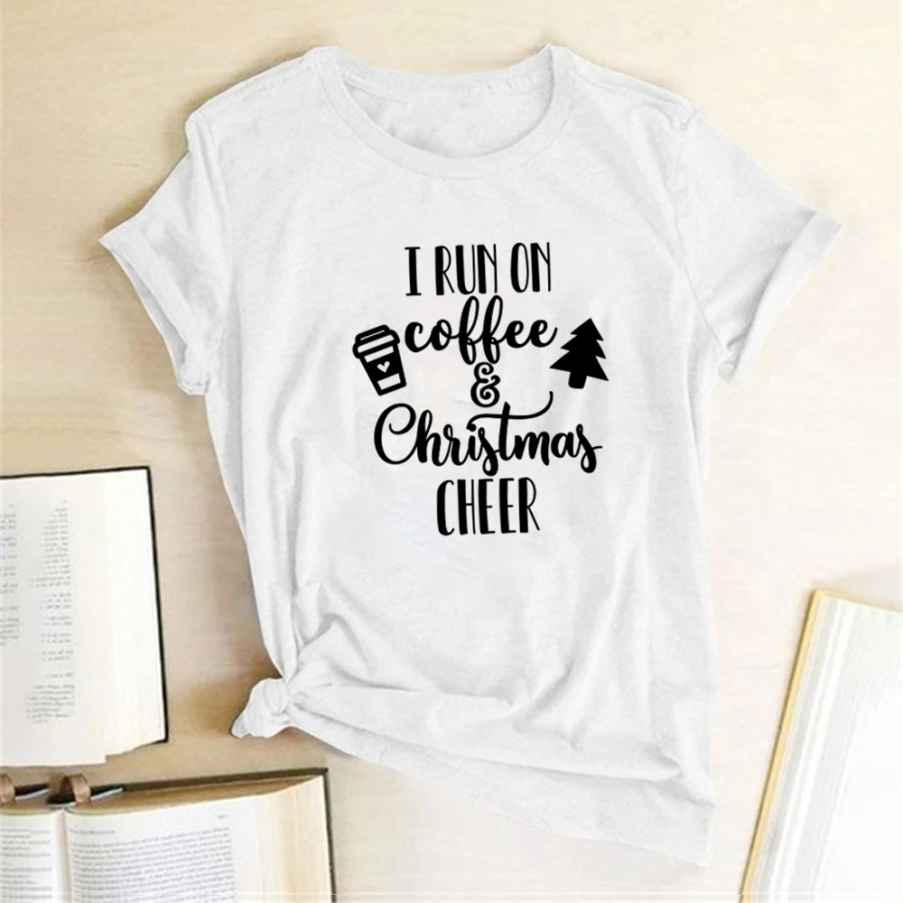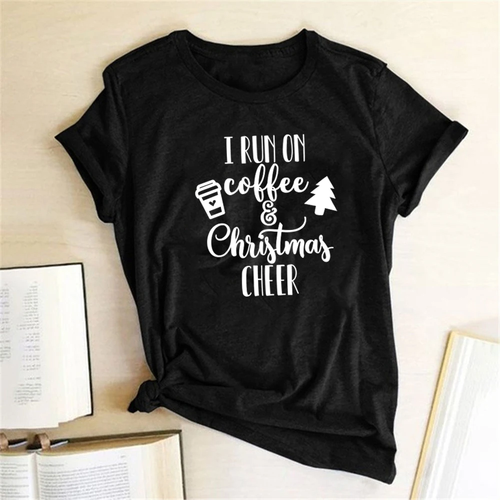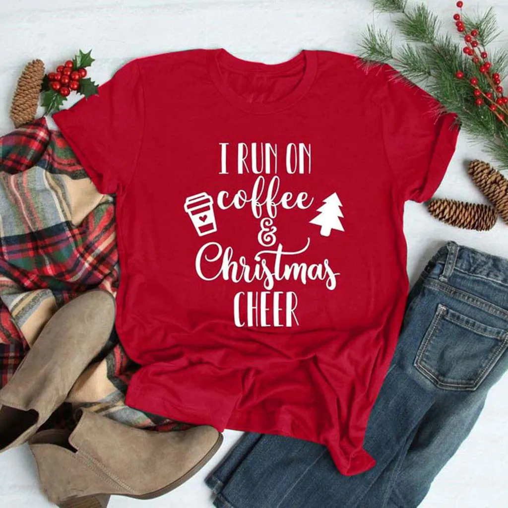 Женская футболка с рождественским принтом I Run On Coffee, Рождественская Праздничная футболка, Топы, одежда, милые зимние подарочные футболки с графическим принтом, 2020