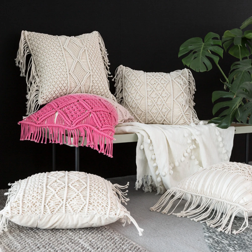 Подушка для дивана 45*45 см, хлопковая веревка, макраме, хлопковая нить ручной работы, наволочка, Геометрическая подушка в богемном стиле, чехол для подушки, домашний декор
